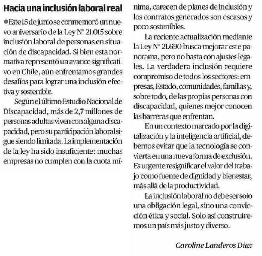 Hacia una inclusión laboral real 18-06-2025 El Mercurio de Calama |
