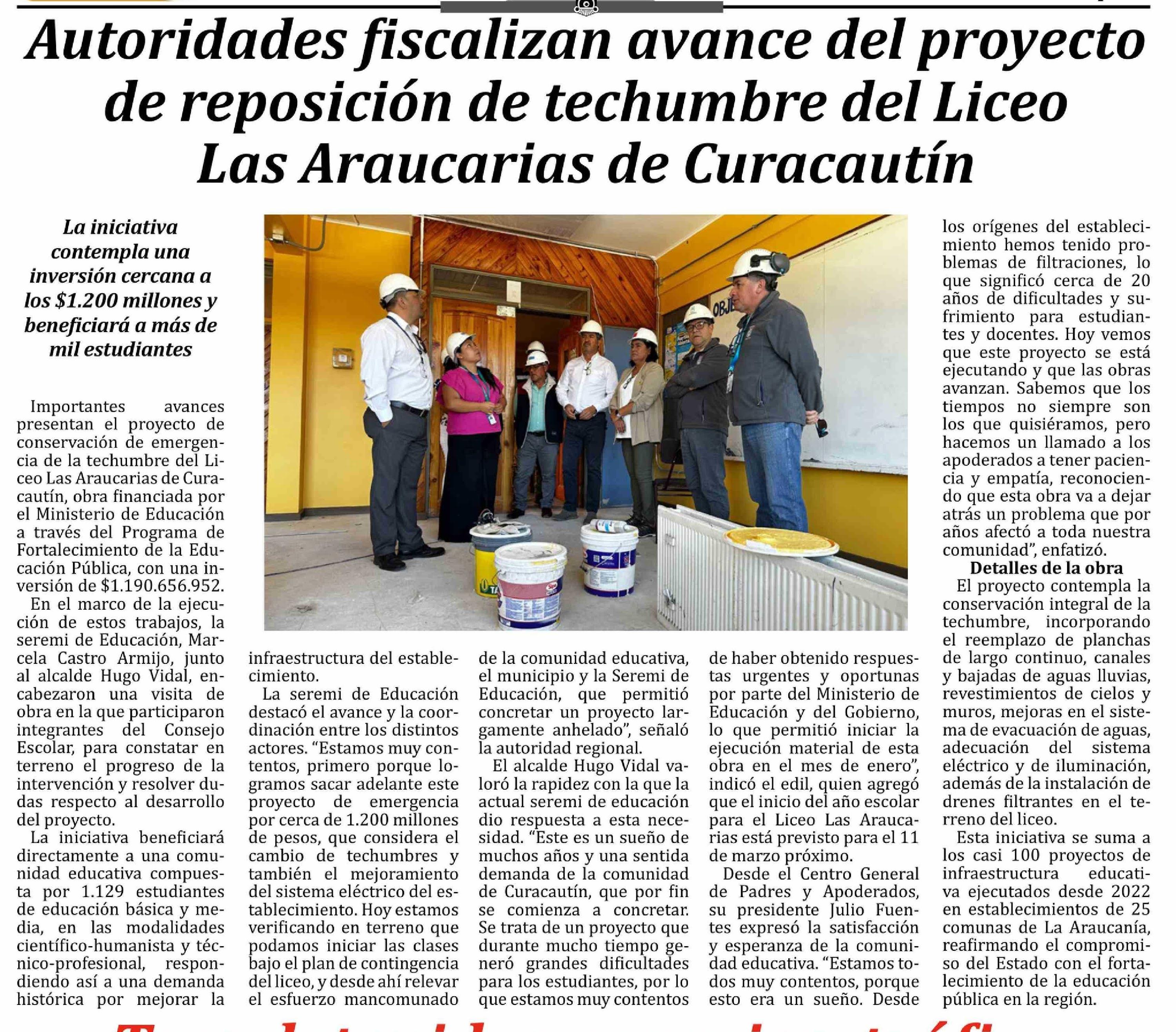 Autoridades fiscalizan avance del proyecto de reposición de techumbre del Liceo Las Araucarias de Curacautín 26-02-2026 Las Noticias |