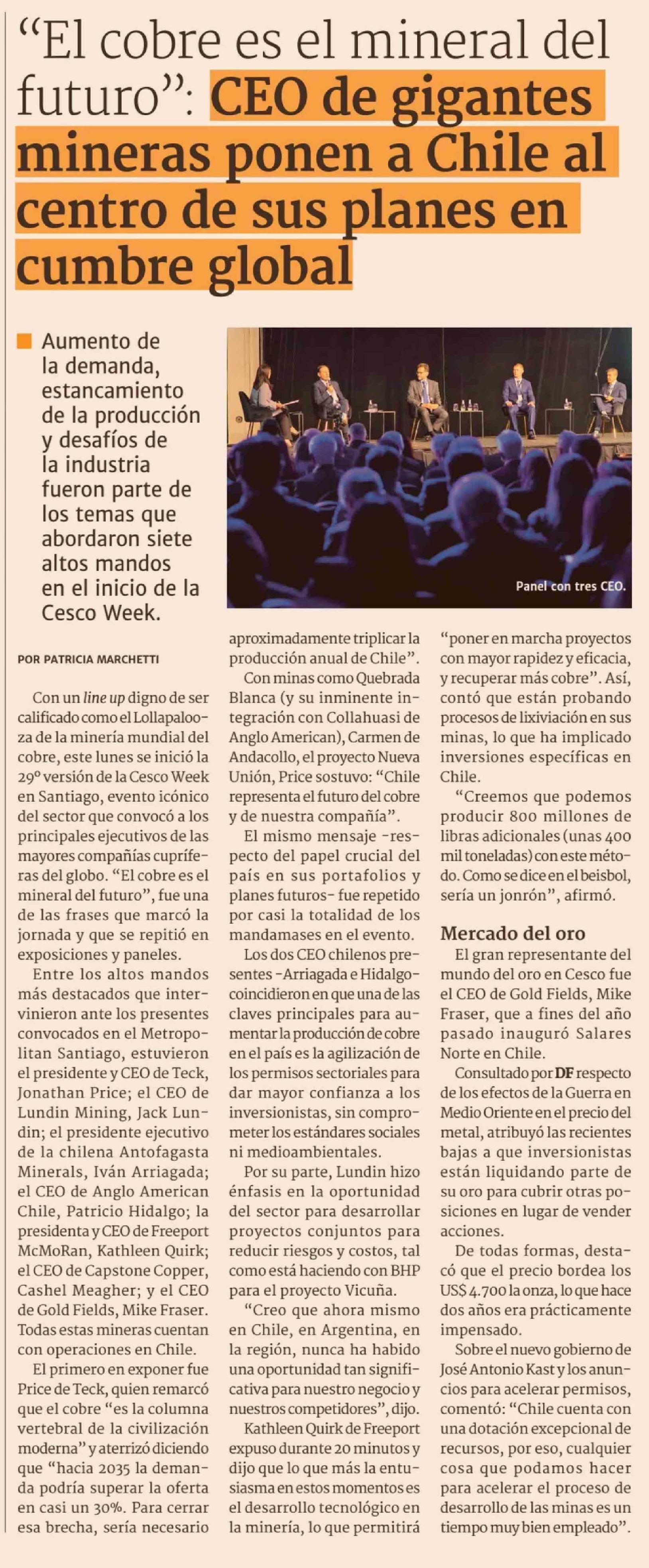 "El cobre es el mineral del futuro": CEO de gigantes mineras ponen a Chile al centro de sus planes en cumbre global 14-04-2026 Diario Financiero |