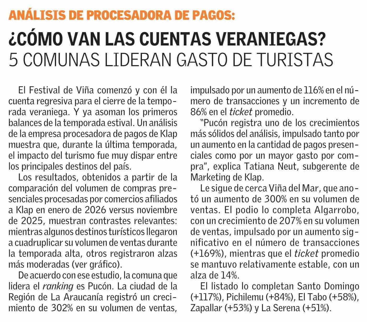 Título: ¿CÓMO VAN LAS CUENTAS VERANIEGAS? 5 COMUNAS LIDERAN GASTO DE TURISTAS