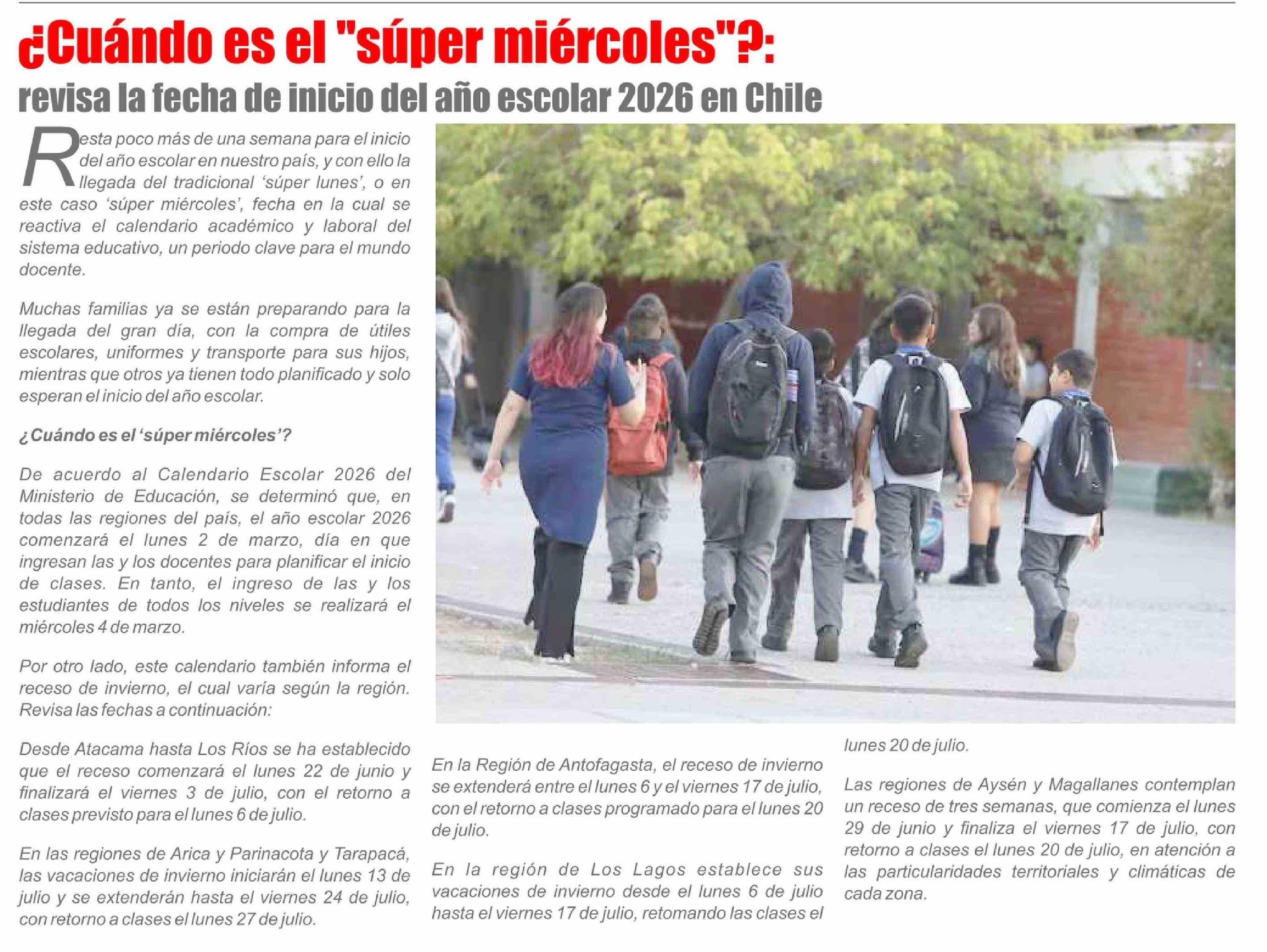 ¿Cuándo es el "súper miércoles" ?: revisa la fecha de inicio del año escolar 2026 en Chile 27-02-2026 El Labrador |