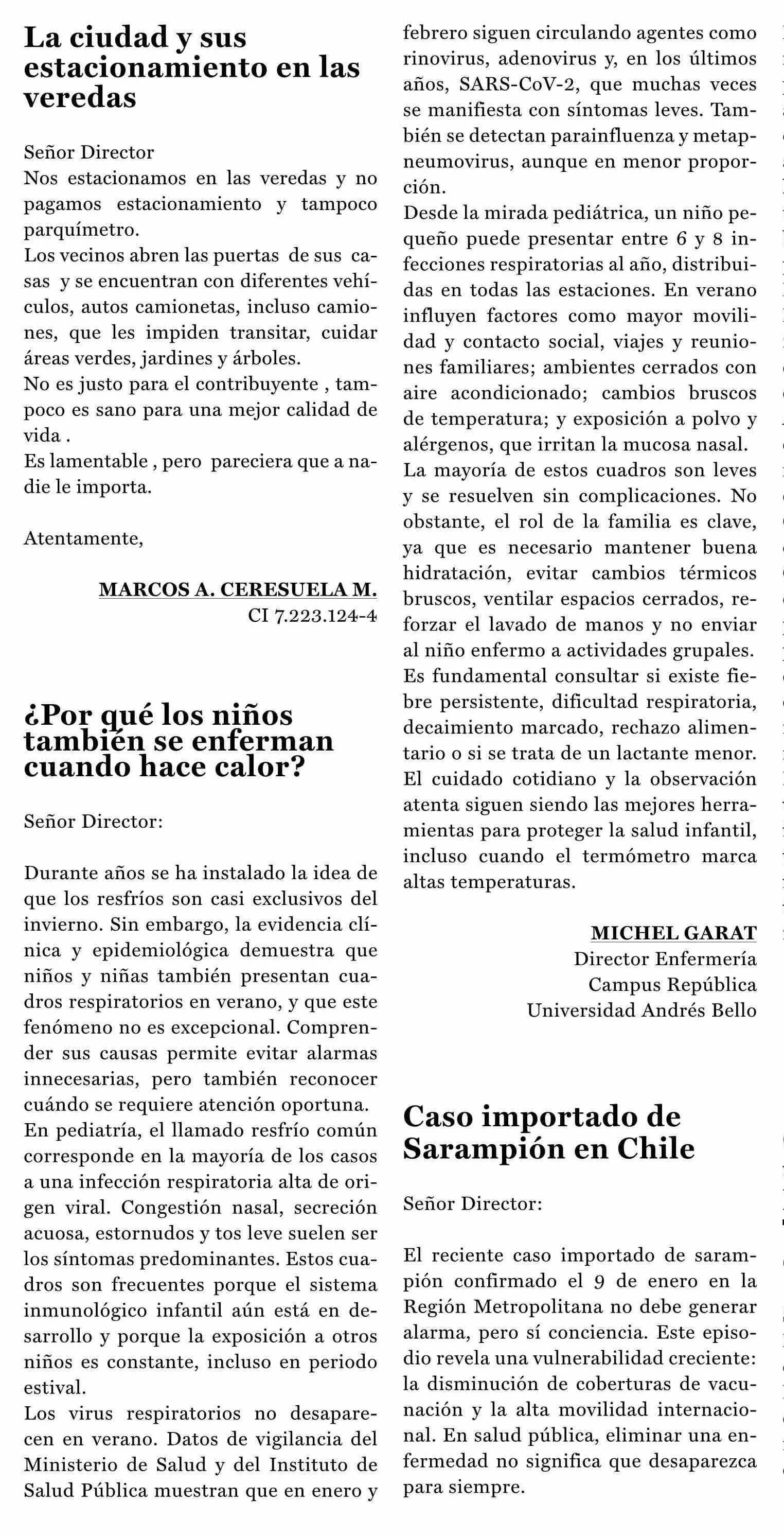 Cartas: ¿Por qué los niños tambien se enferman cuando hace calor? 13-01-2026 La Prensa de Curicó |