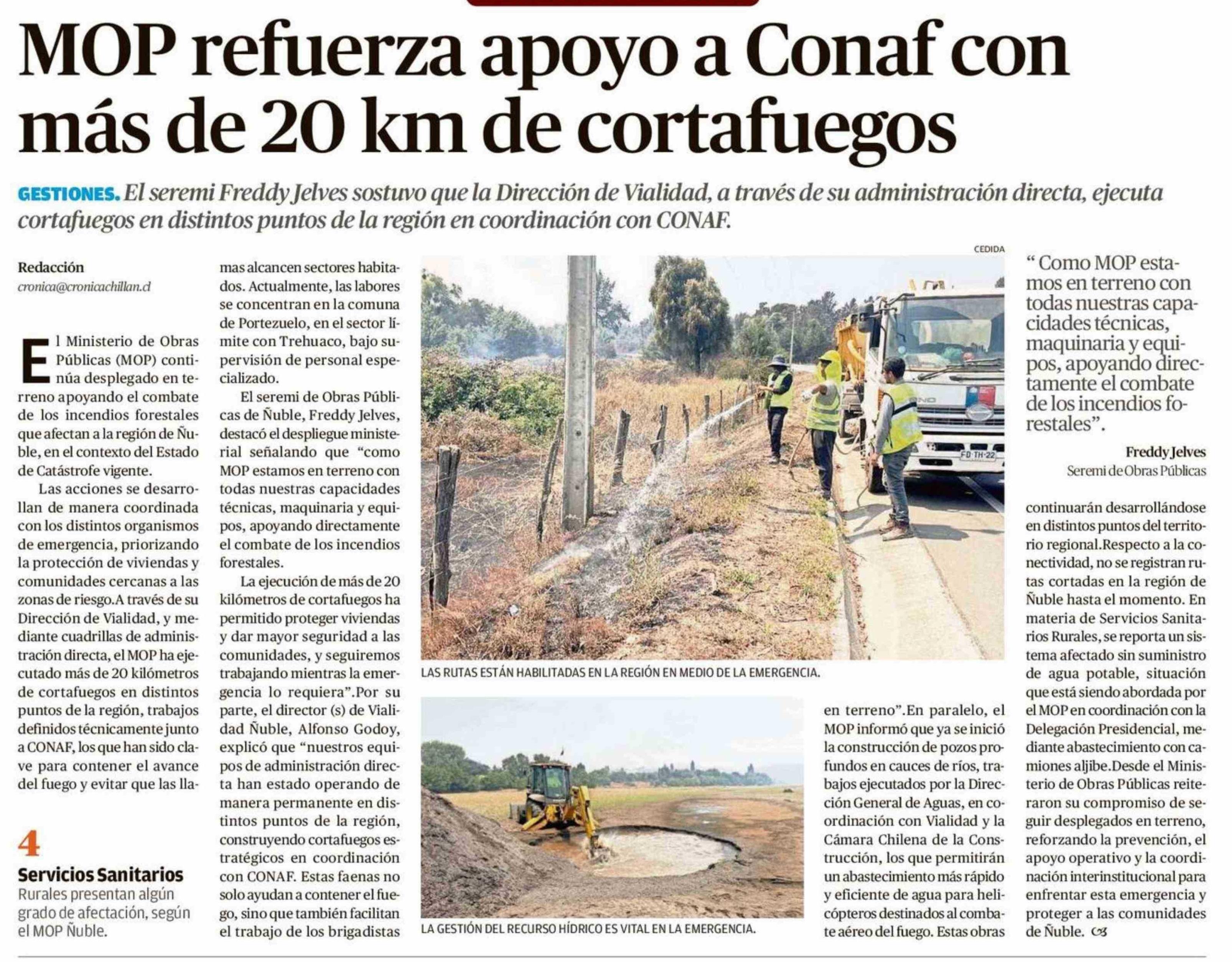 MOP refuerza apoyo a Conaf con más de 20 km de cortafuegos 20-01-2026 Crónica de Chillán |
