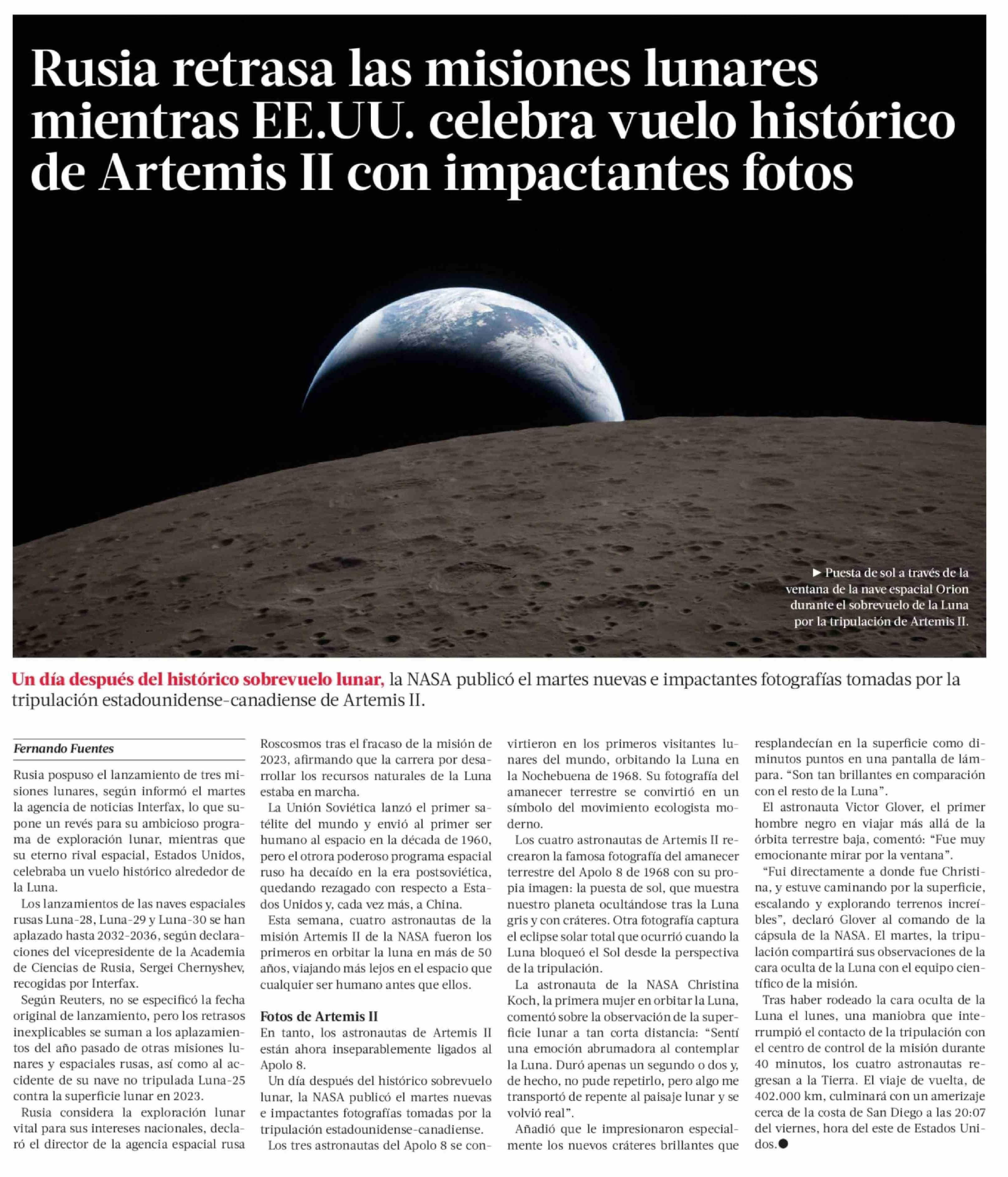 | Título: | Rusia retrasa las misiones lunares mientras EE.UU. celebra vuelo histórico de Artemis II con impactantes fotos |