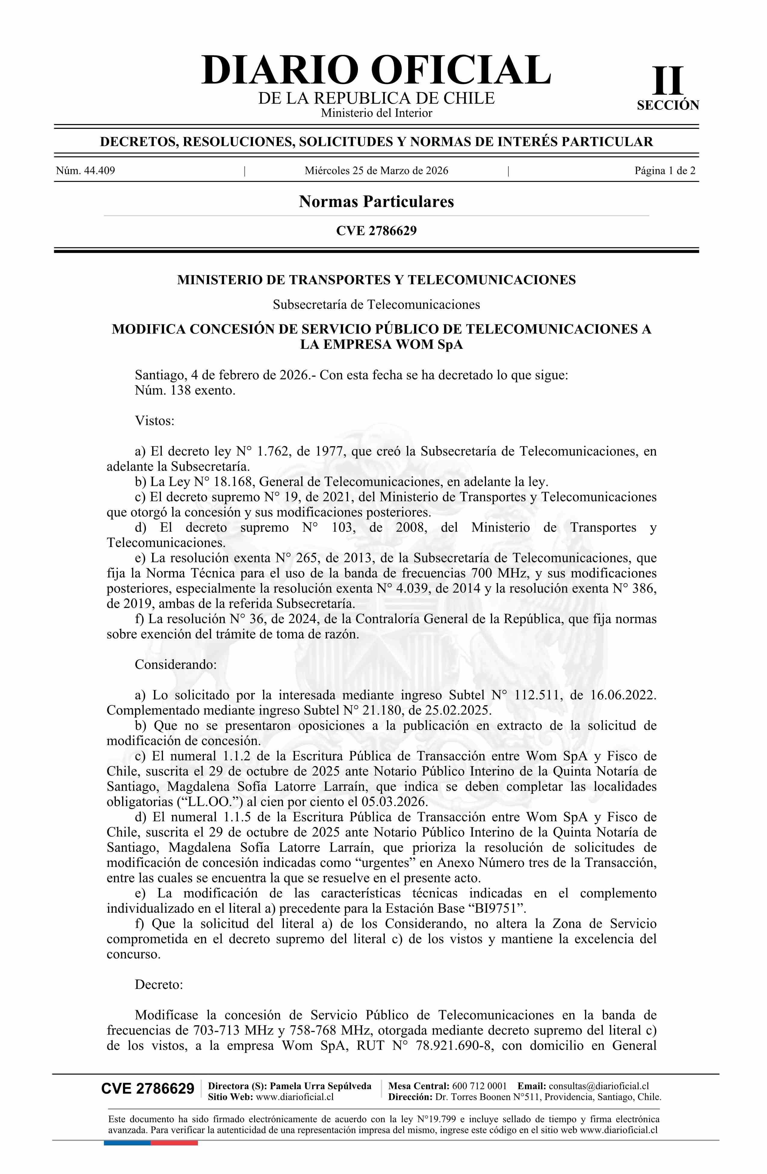 Decreto exento número 138, de 2026.- Modifica concesión de servicio público de telecomunicaciones a la empresa Wom SpA 25-03-2026 Diario Oficial Edición Electrónica |