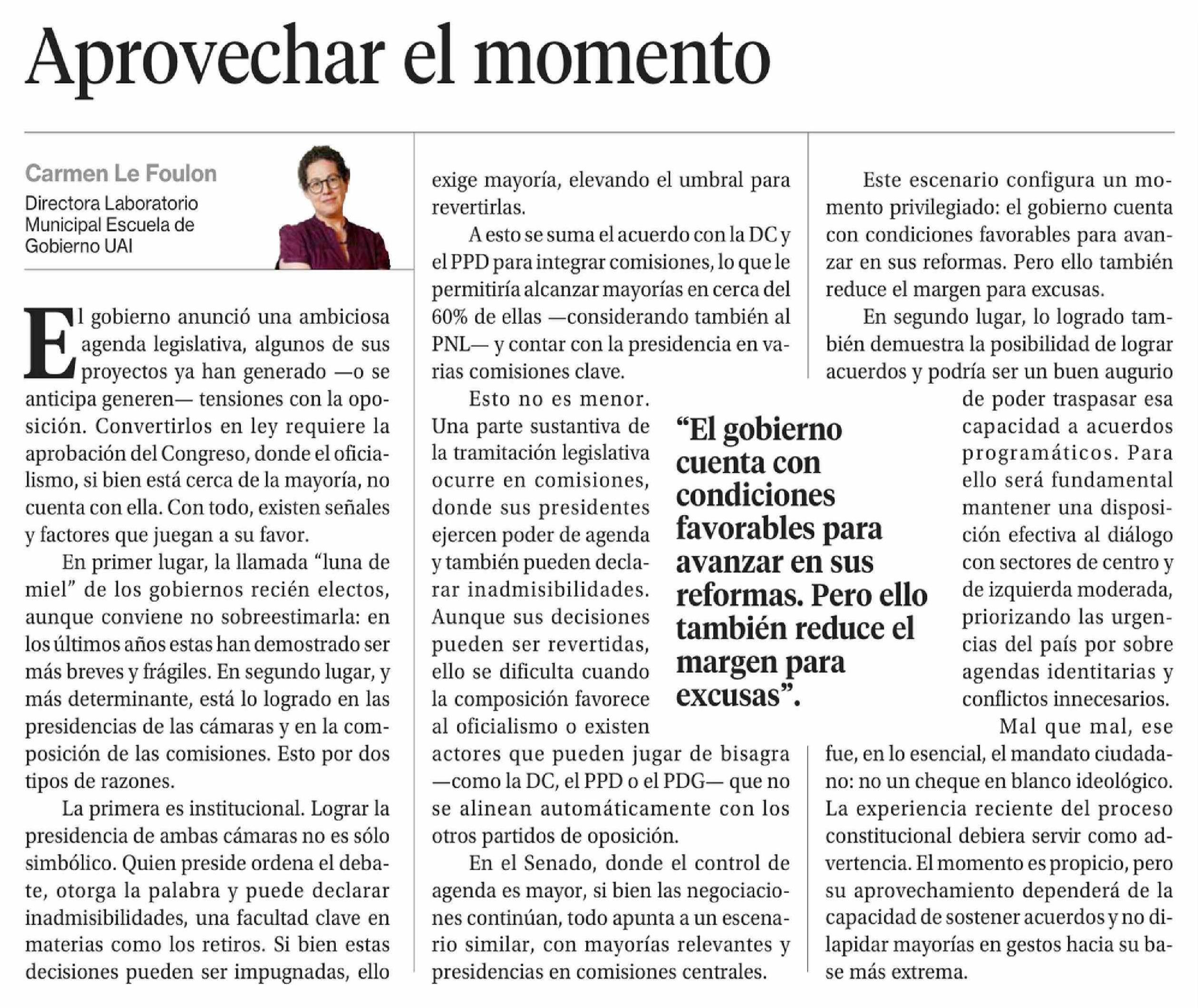 Columnas de Opinión: Aprovechar el momento 18-03-2026 La Segunda |