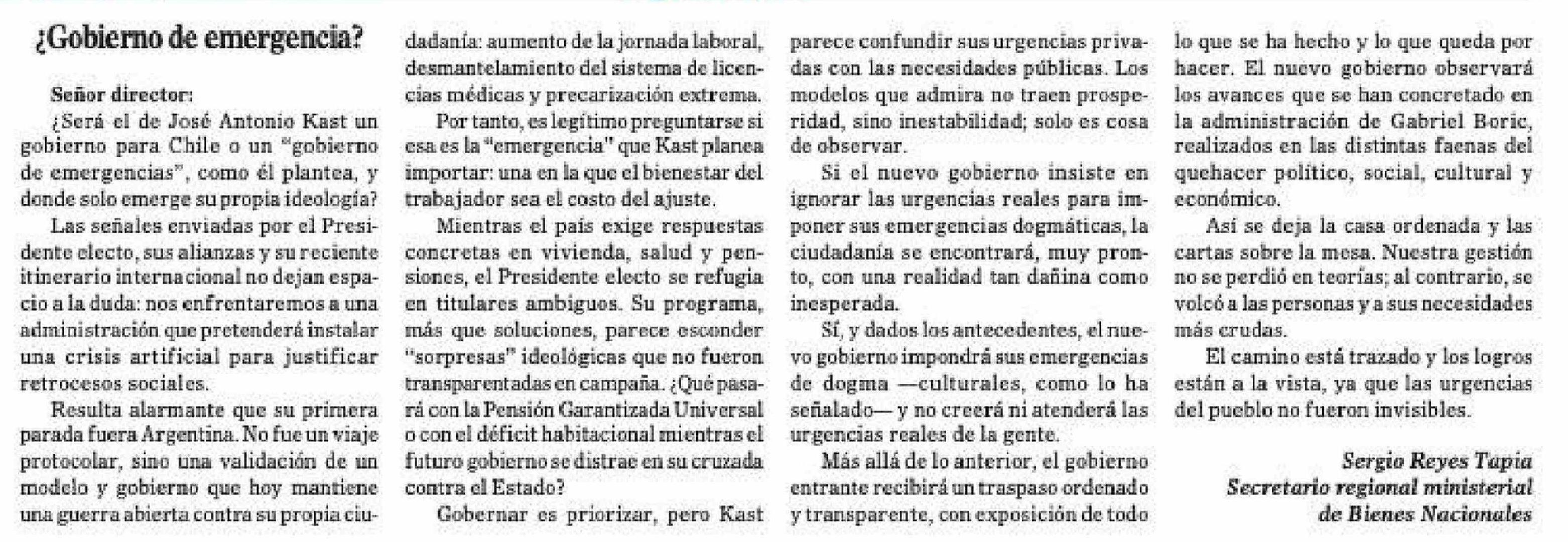Columnas de Opinión: ¿Gobierno de emergencia? 22-02-2026 El Magallanes |