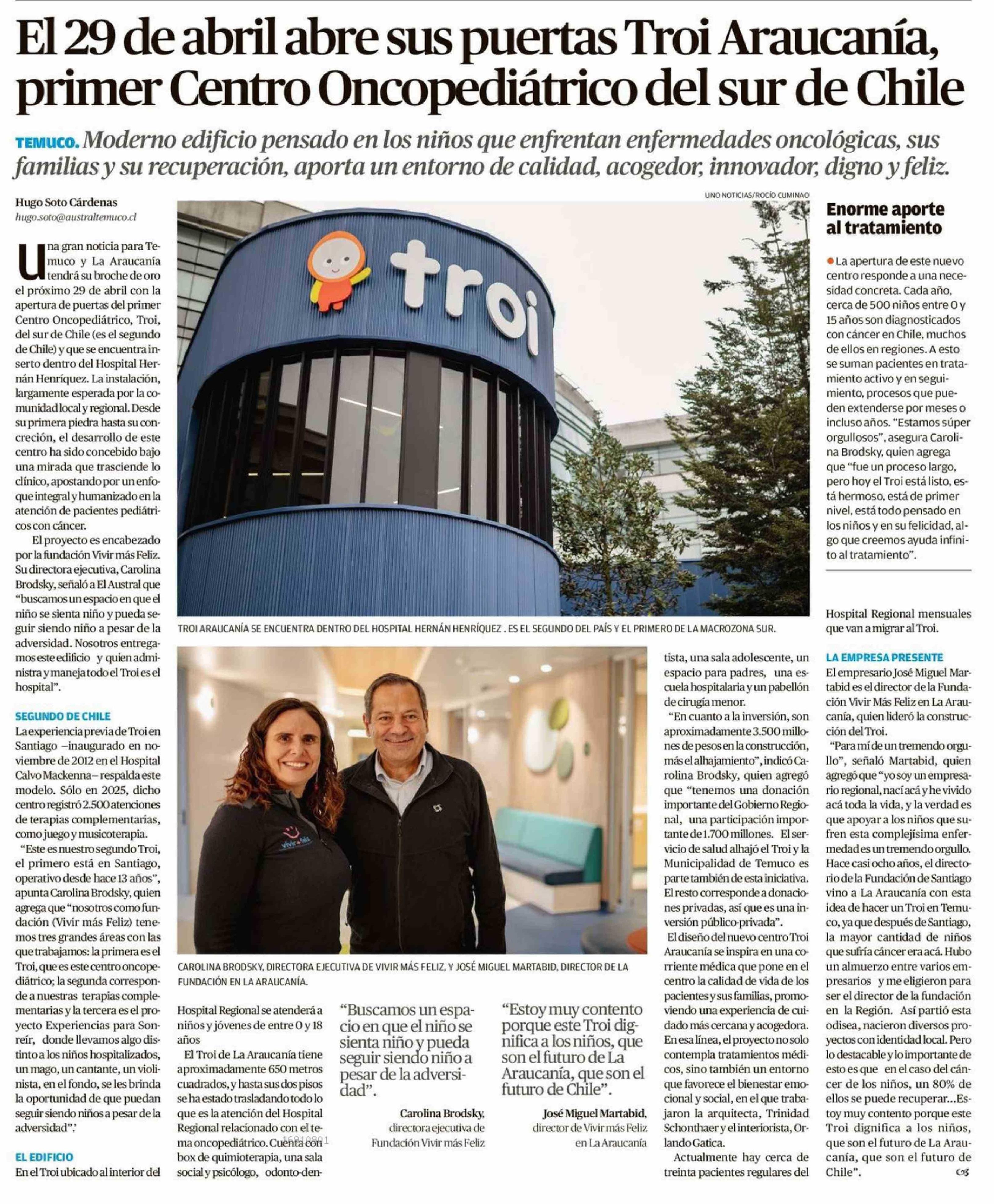 El 29 de abril abre sus puertas Troi Araucanía, primer Centro Oncopediátrico del sur de Chile 11-04-2026 El Austral de la Araucanía |