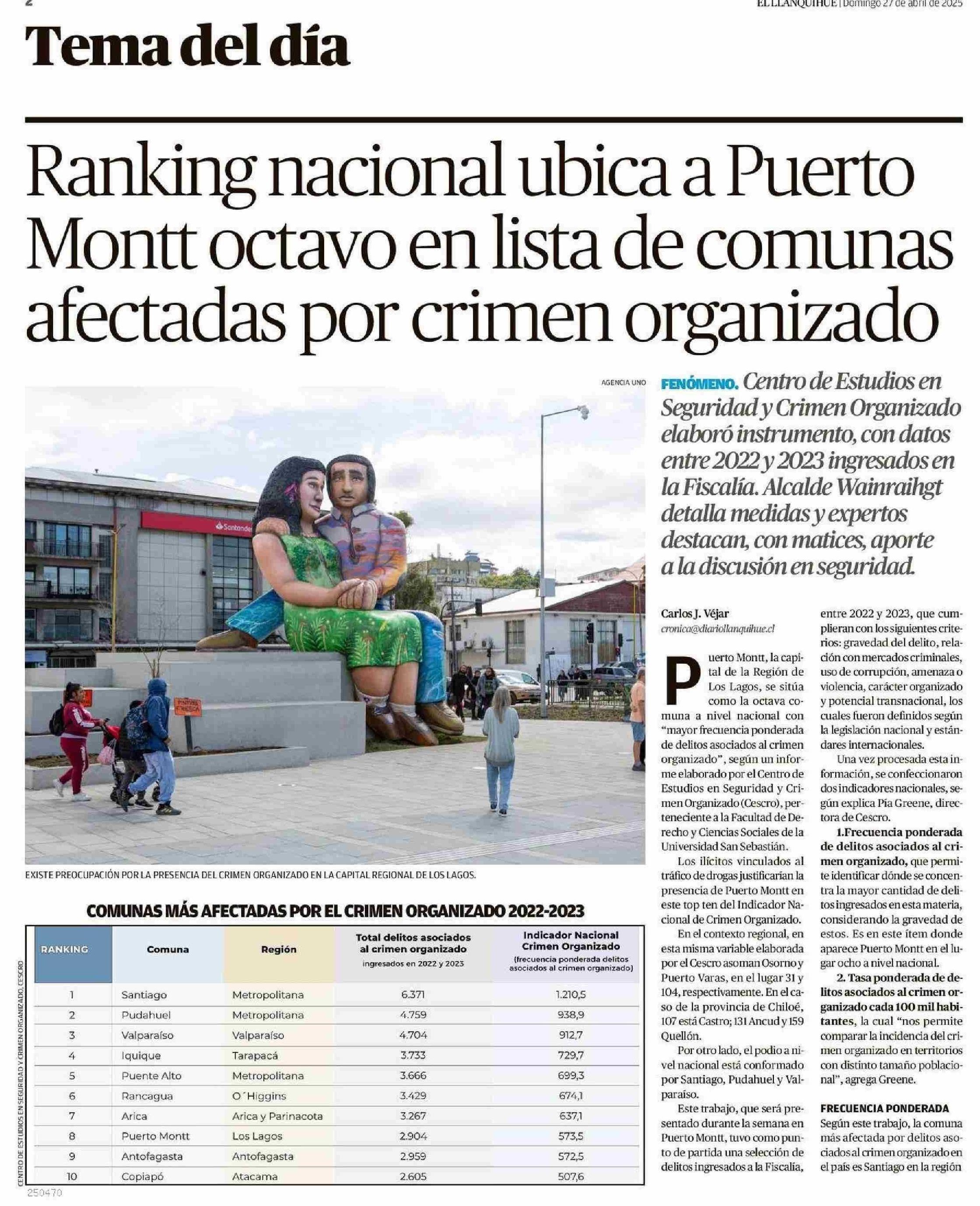 Ranking nacional ubica a Puerto Montt octavo en lista de comunas afectadas por crimen organizado 27-04-2025 El Llanquihue |