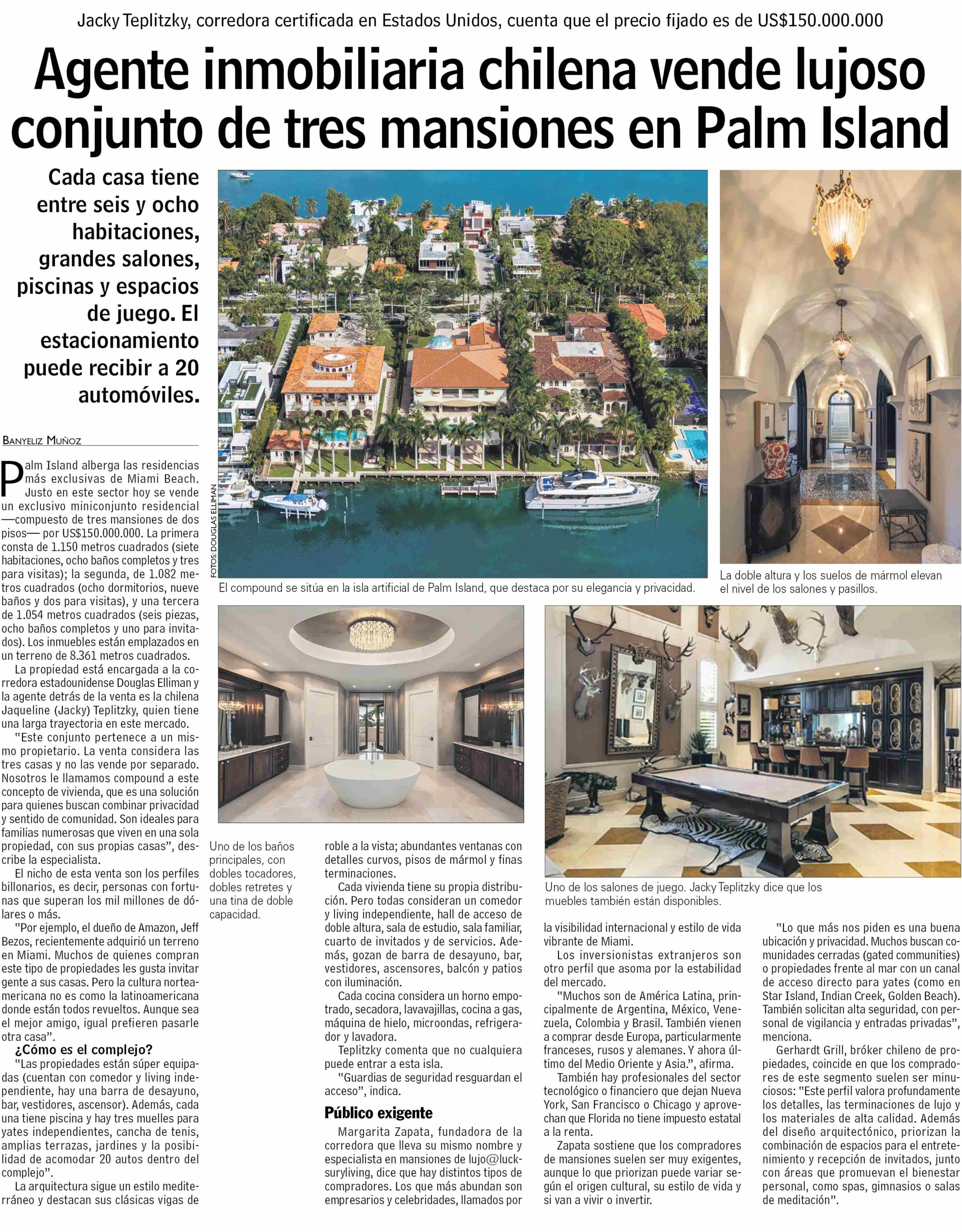 Agente inmobiliaria chilena vende lujoso conjunto de tres mansiones en Palm Island 07-06-2025 Las Últimas Noticias |