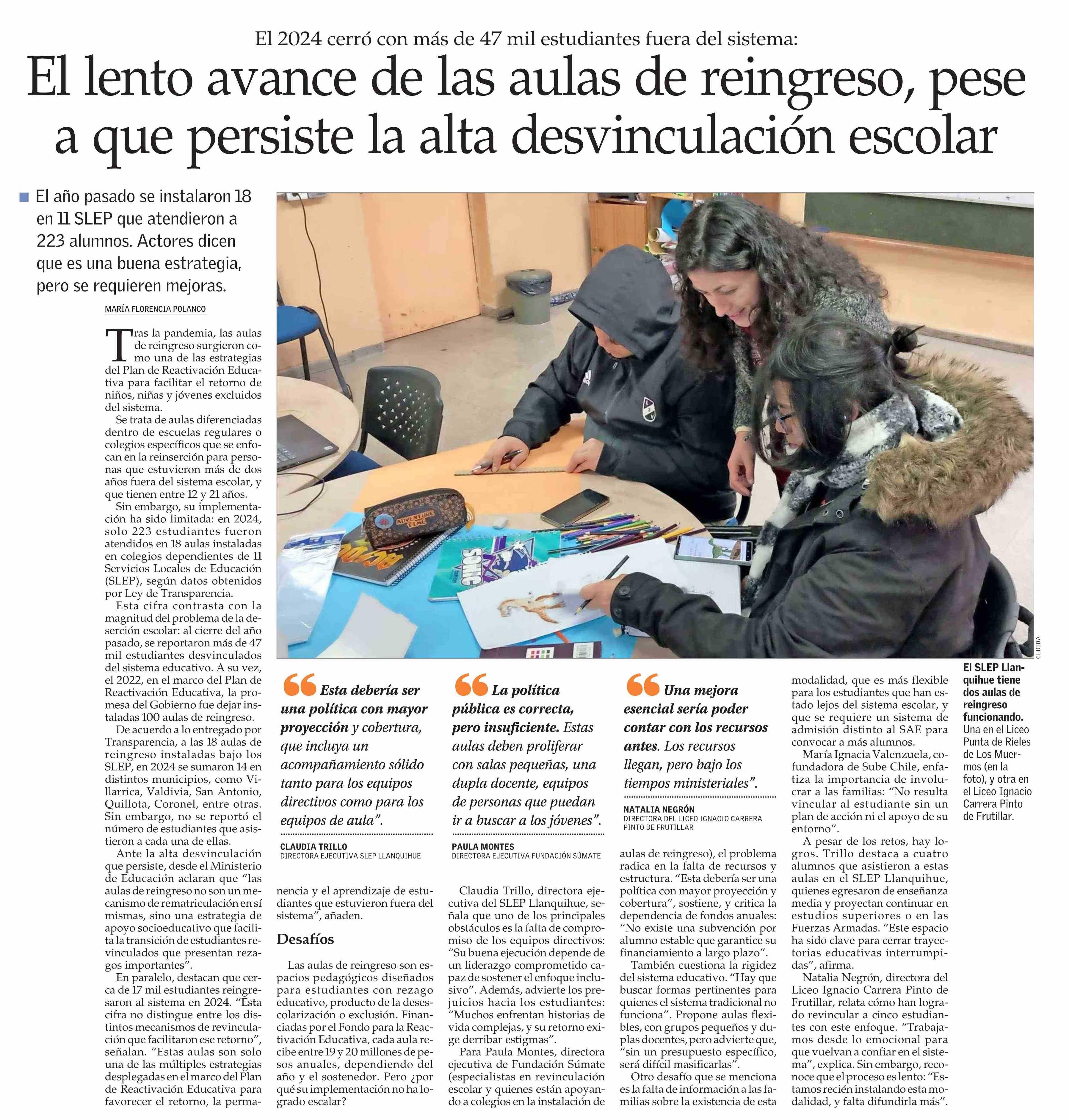El lento avance de las aulas de reingreso, pese a que persiste la alta desvinculación escolar 09-06-2025 El Mercurio |
