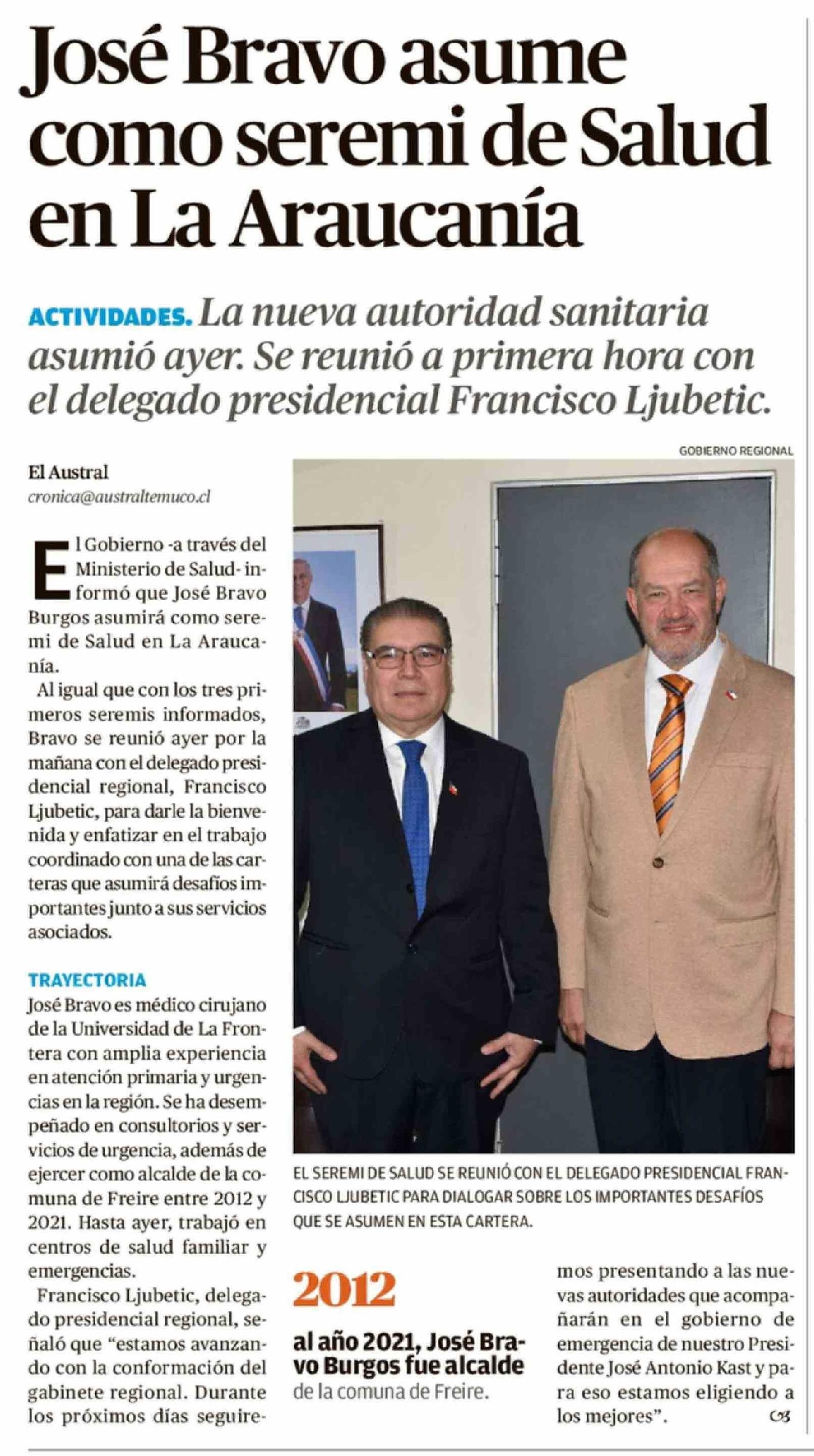 José Bravo asume como seremi de Salud en La Araucanía 27-03-2026 El Austral de la Araucanía |
