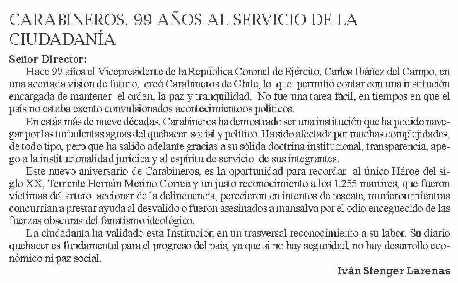 | Título: | Cartas: CARABINEROS, 99 AÑOS AL SERVICIO DE LA CIUDADANÍA |