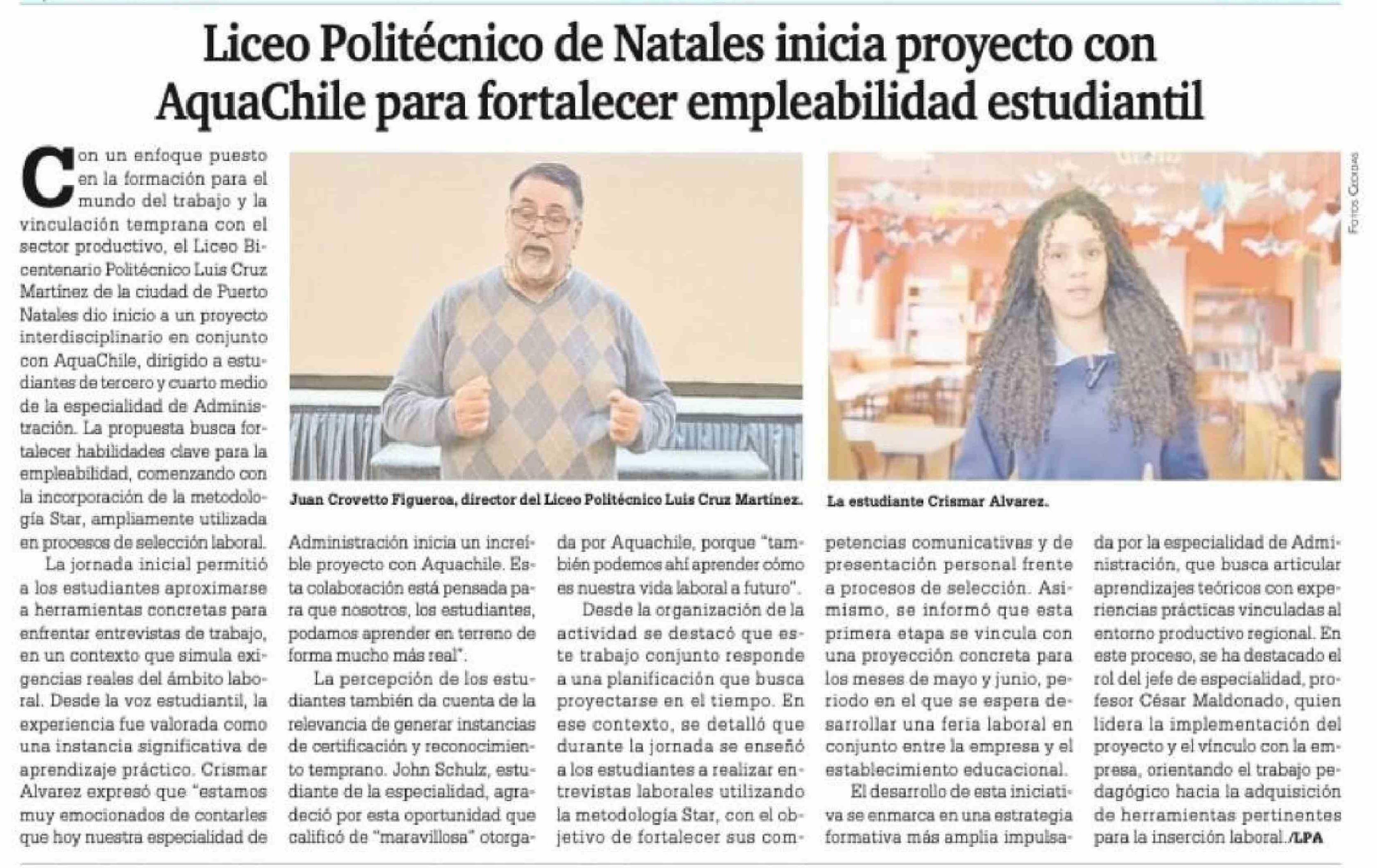 Liceo Politécnico de Natales inicia proyecto con AquaChile para fortalecer empleabilidad estudiantil 16-04-2026 La Prensa Austral |