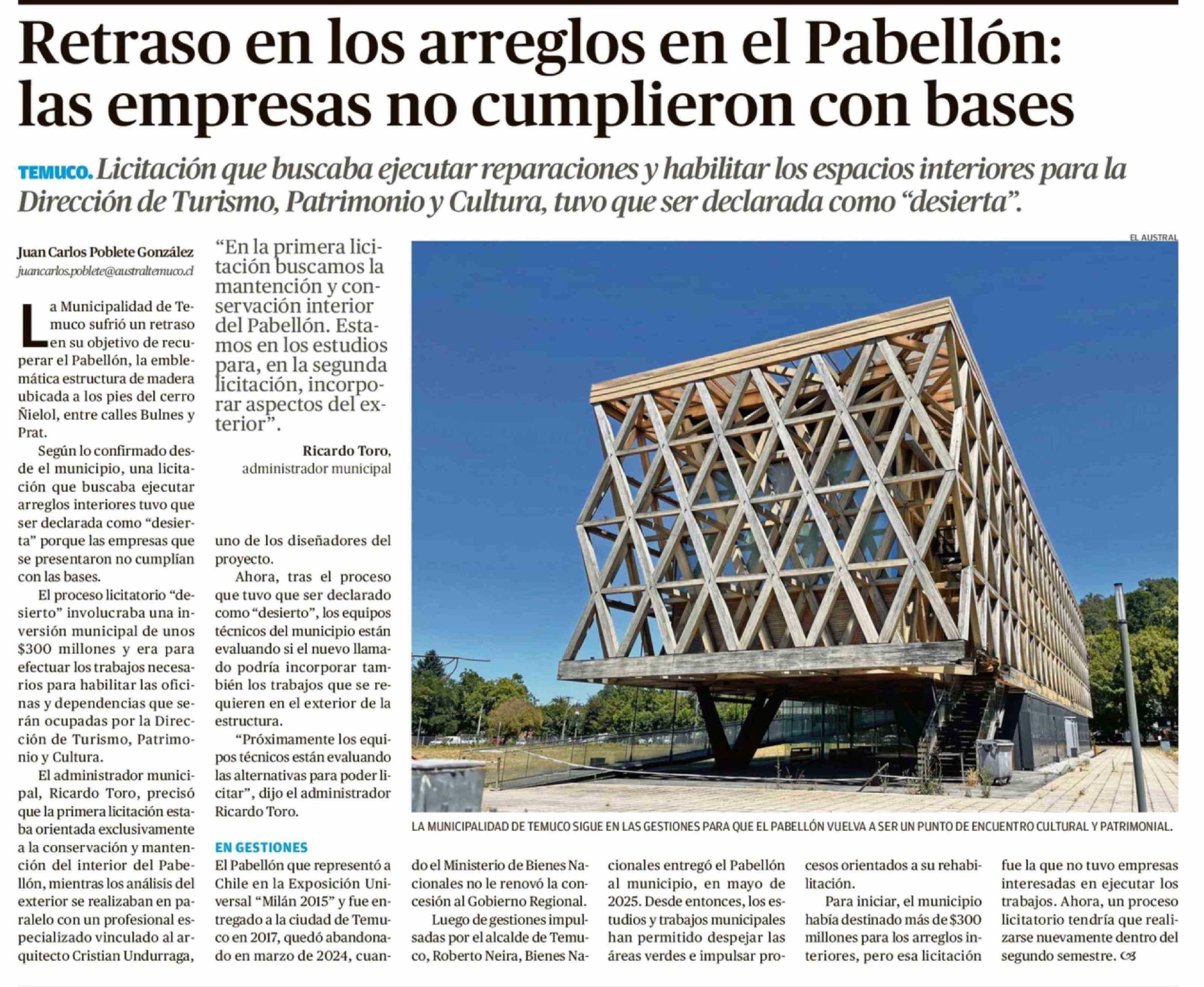 Retraso en los arreglos en el Pabellón: las empresas no cumplieron con bases 21-03-2026 El Austral de la Araucanía |