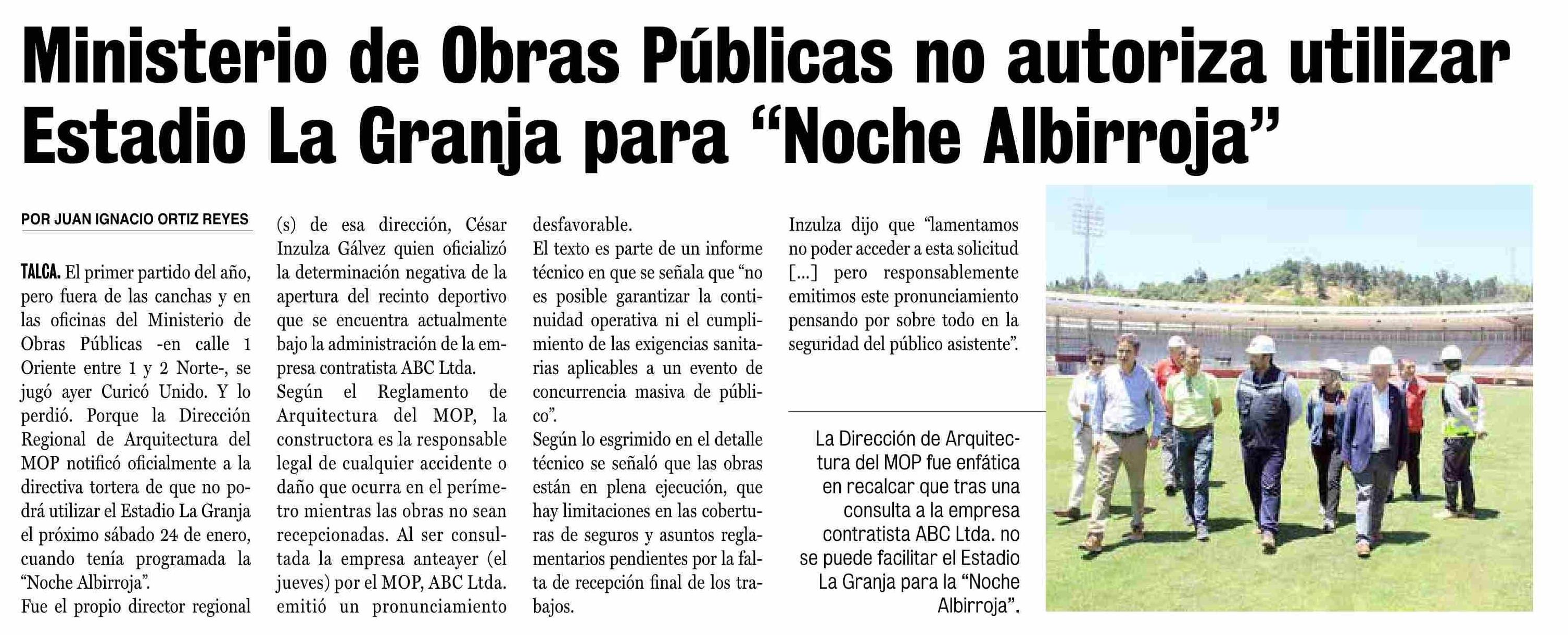 Ministerio de Obras Públicas no autoriza utilizar Estadio La Granja para "Noche Albirroja" 17-01-2026 La Prensa de Curicó |
