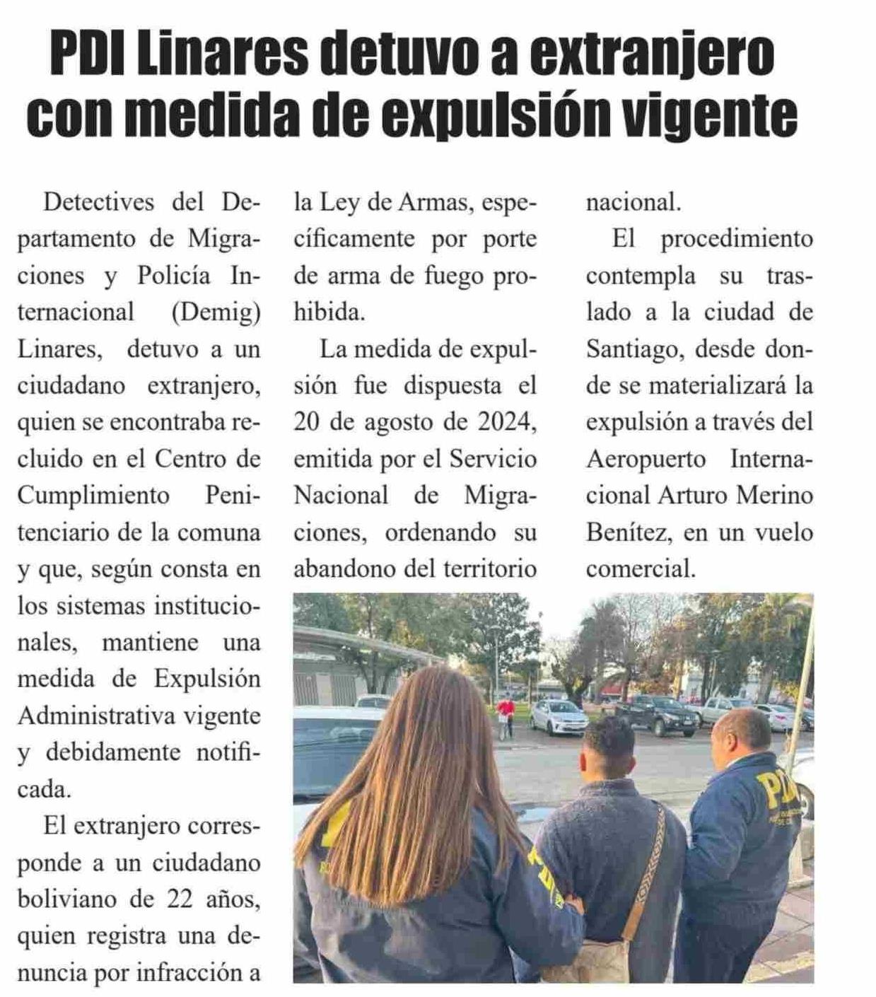 | Título: | PDI Linares detuvo a extranjero con medida de expulsión vigente |