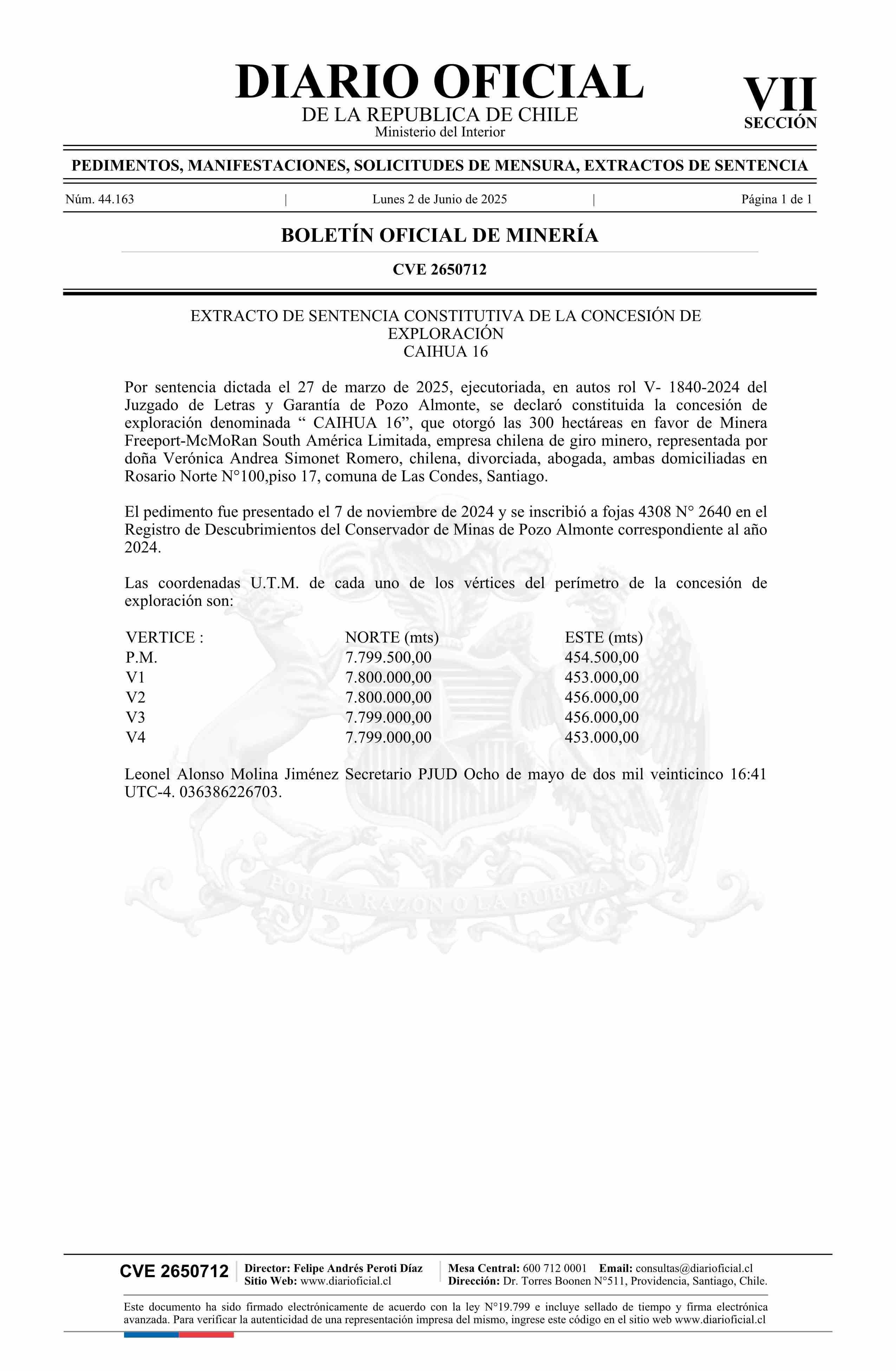 CAIHUA 16 / Minera Freeport-McMoRan South America Limitada 02-06-2025 DIARIO OFICIAL CHILE - BOLETÍN OFICIAL DE MINERÍA |