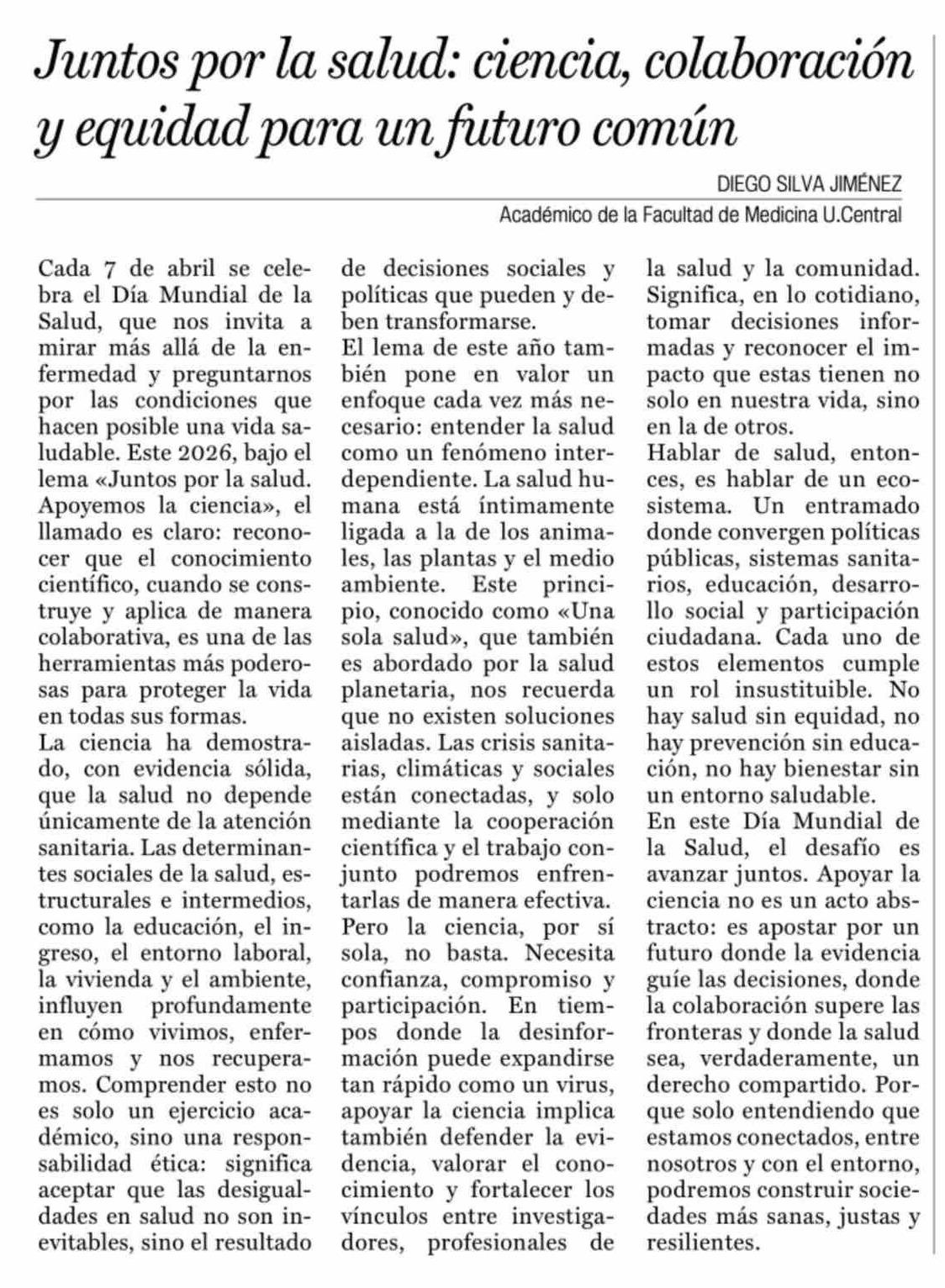 Columnas de Opinión: Juntos por la salud: ciencia, colaboración y equidad para un futuro común 04-04-2026 La Prensa de Curicó |