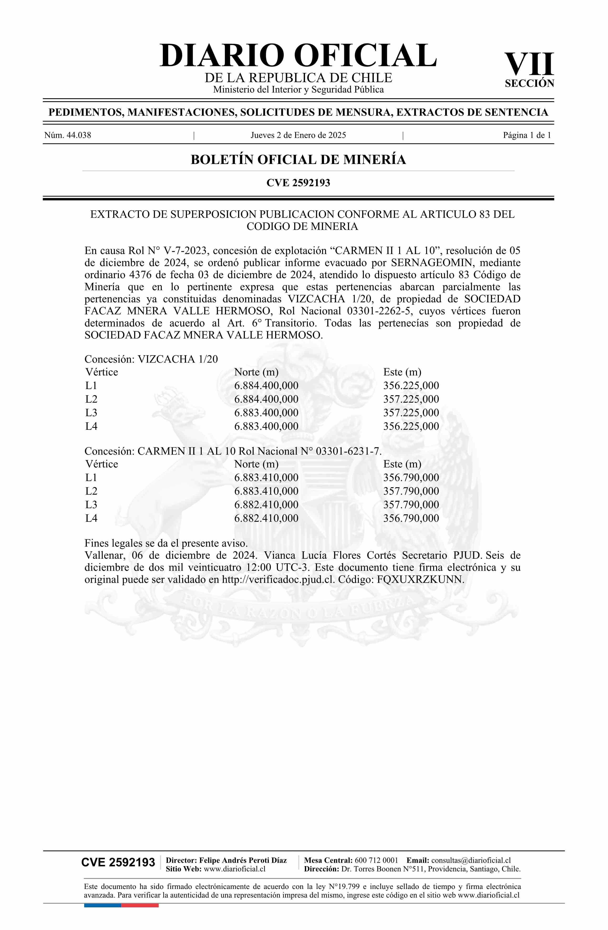 CARMEN II 1 AL 10 / Sociedad Facaz Minera Valle Hermoso 02-01-2025 DIARIO OFICIAL CHILE - BOLETÍN OFICIAL DE MINERÍA |