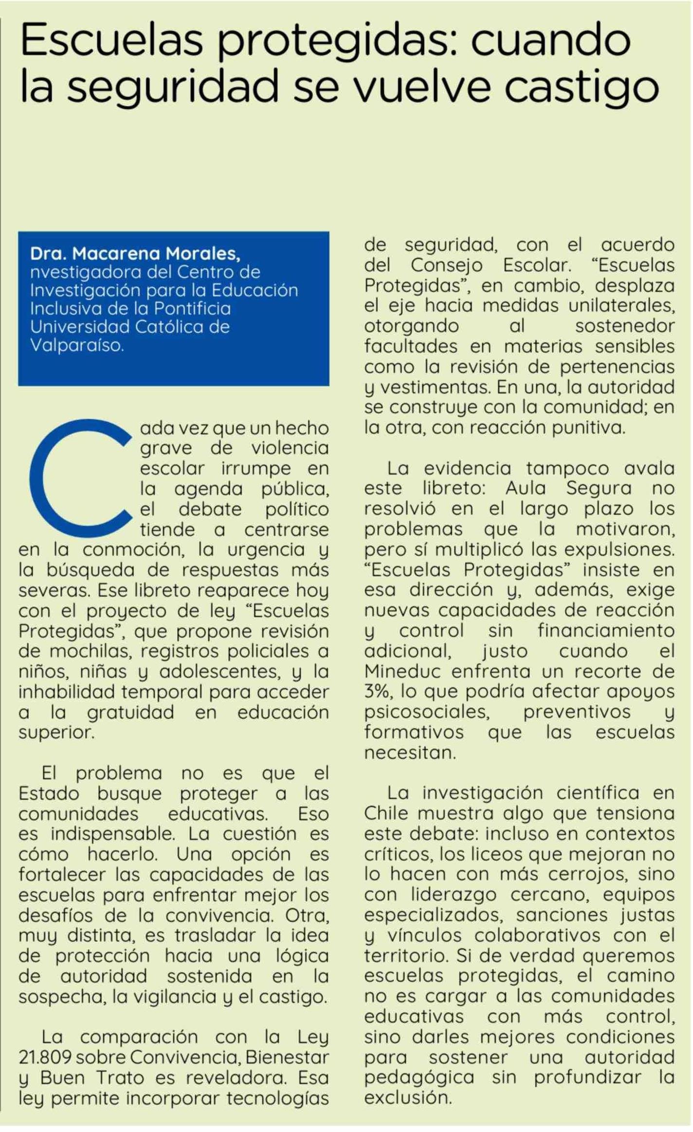 | Título: | Columnas de Opinión: Escuelas protegidas: cuando la seguridad se vuelve castigo |