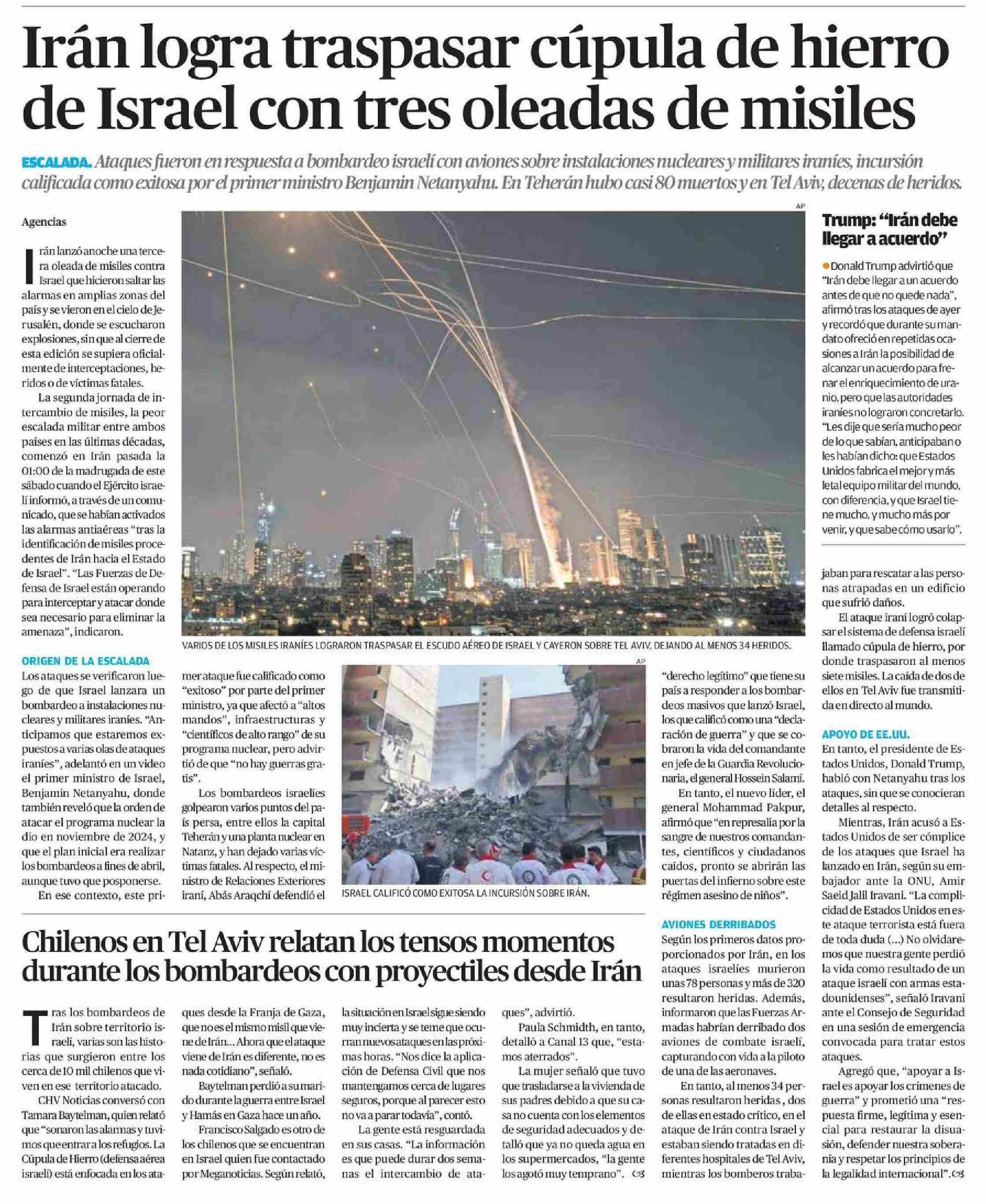 Irán logra traspasar cúpula de hierro de Israel con tres oleadas de misiles 14-06-2025 El Mercurio de Calama |