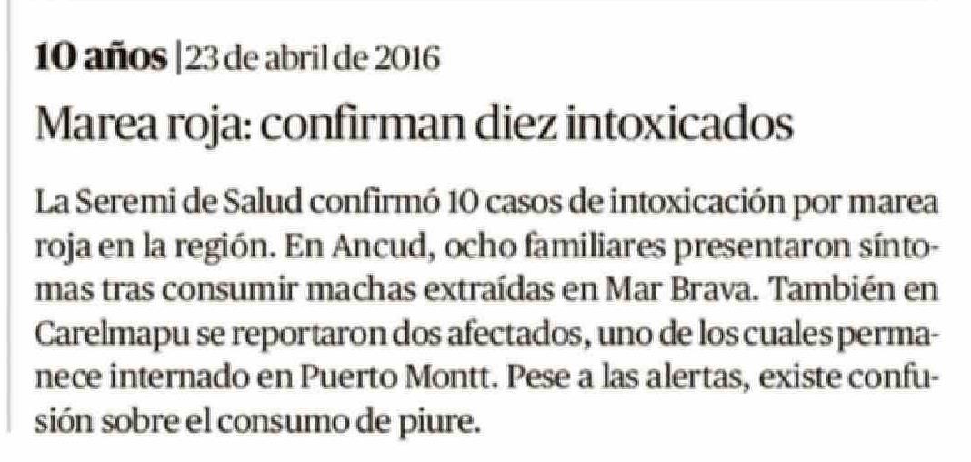Título: 10 años |23 de abril de 2016 Marea roja: confirman diez intoxicados La Seremi de Salud confirmó 10 casos de intoxicación por marea roja en la región. En Ancud, ocho familiares presentaron síntomas tras consumir machas extraídas en Mar Brava. También en Carelmapu se reportaron dos afectados, uno de l