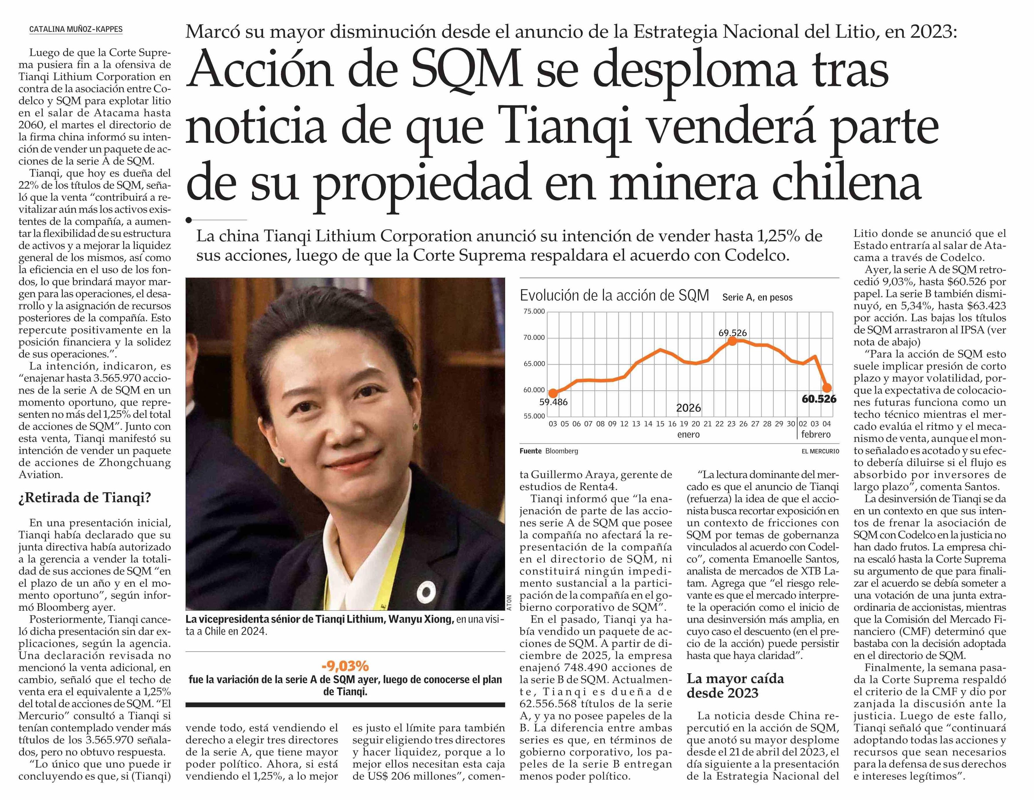 Título: Acción de SQM se desploma tras noticia de que Tianqi venderá parte de su propiedad en minera chilena