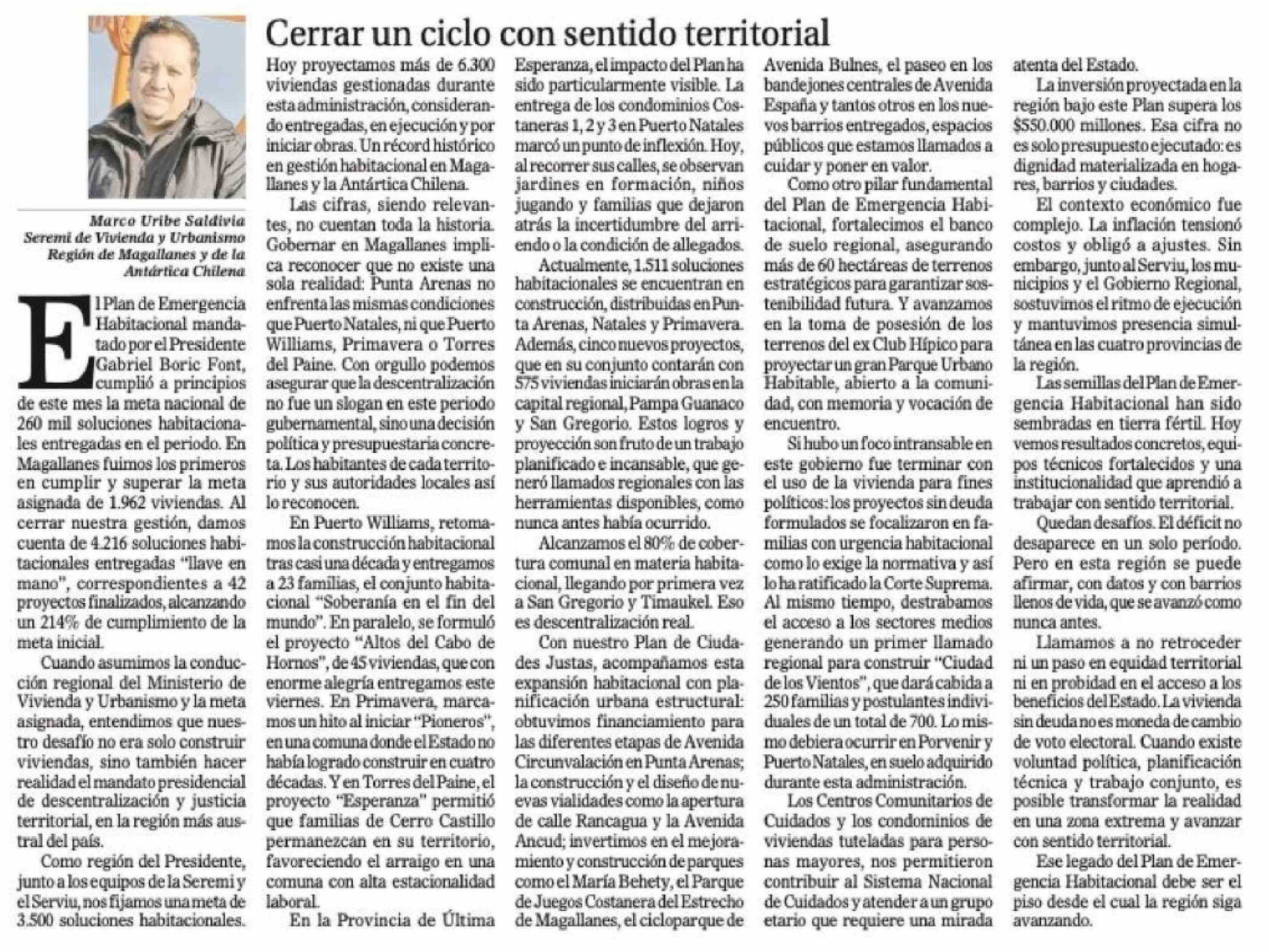 Columnas de Opinión: Cerrar un ciclo con sentido territorial 08-03-2026 El Magallanes |