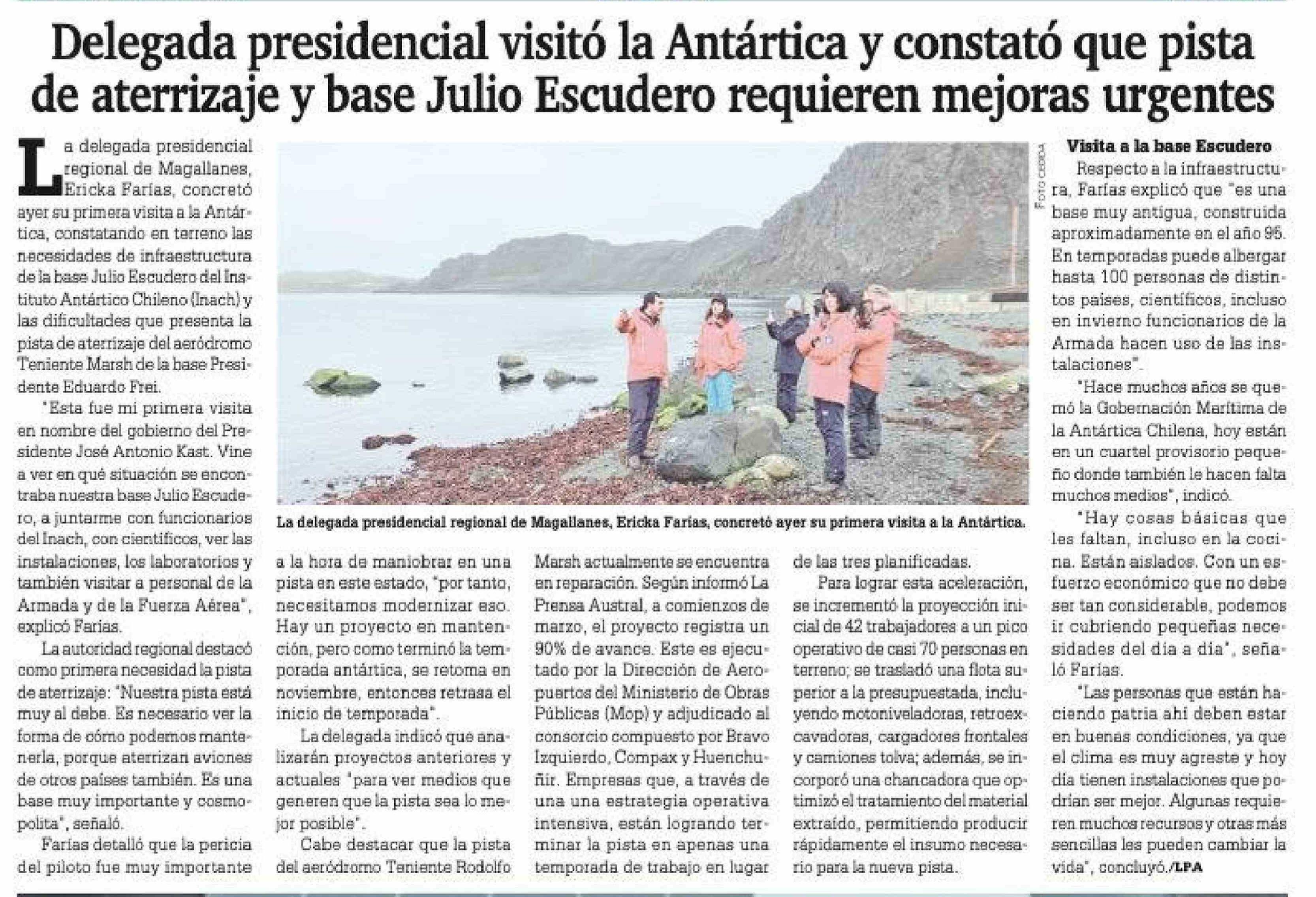 Delegada presidencial visitó la Antártica y constató que pista de aterrizaje y base Julio Escudero requieren mejoras urgentes 30-03-2026 La Prensa Austral |