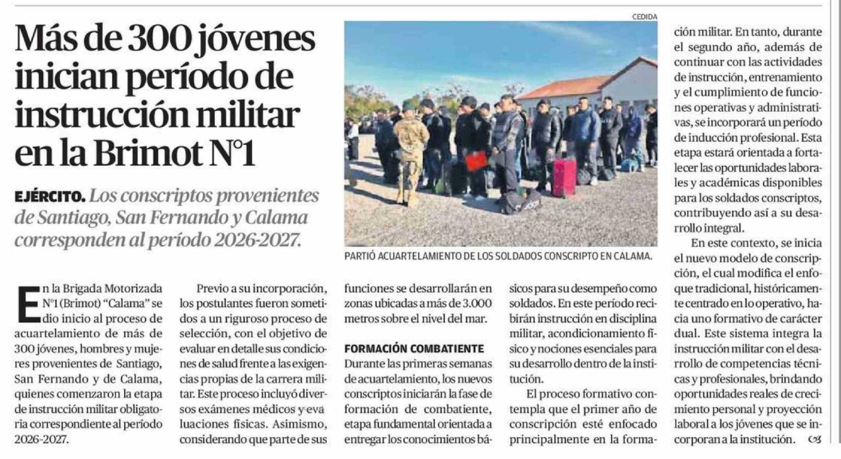 Más de 300 jóvenes inician período de instrucción militar en la Brimot Nº1 19-04-2026 El Mercurio de Calama |