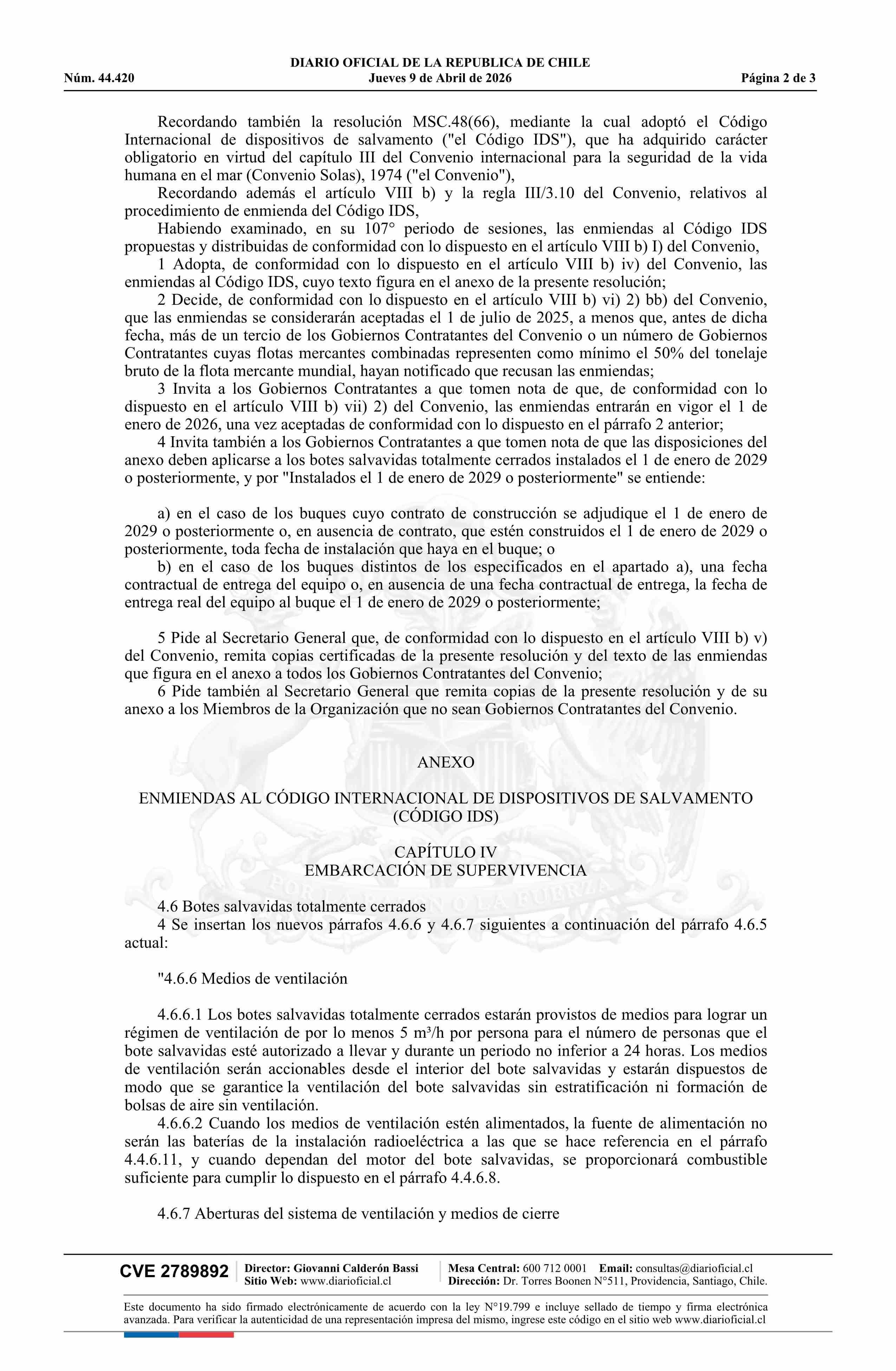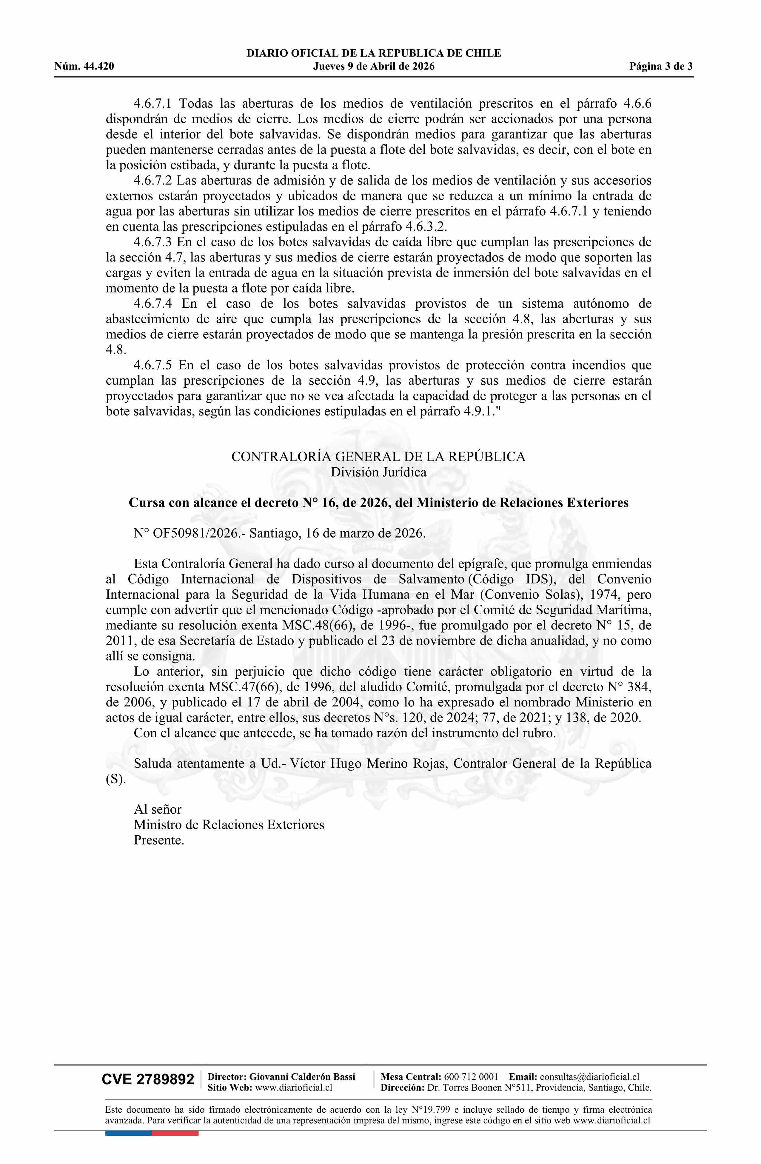 | Título: | Decreto número 16, de 2026.- Promulga Enmiendas al Código Internacional de Dispositivos de Salvamento (Código IDS) del Convenio Internacional para la Seguridad de la Vida Humana en el Mar (Convenio Solas), 1974 |