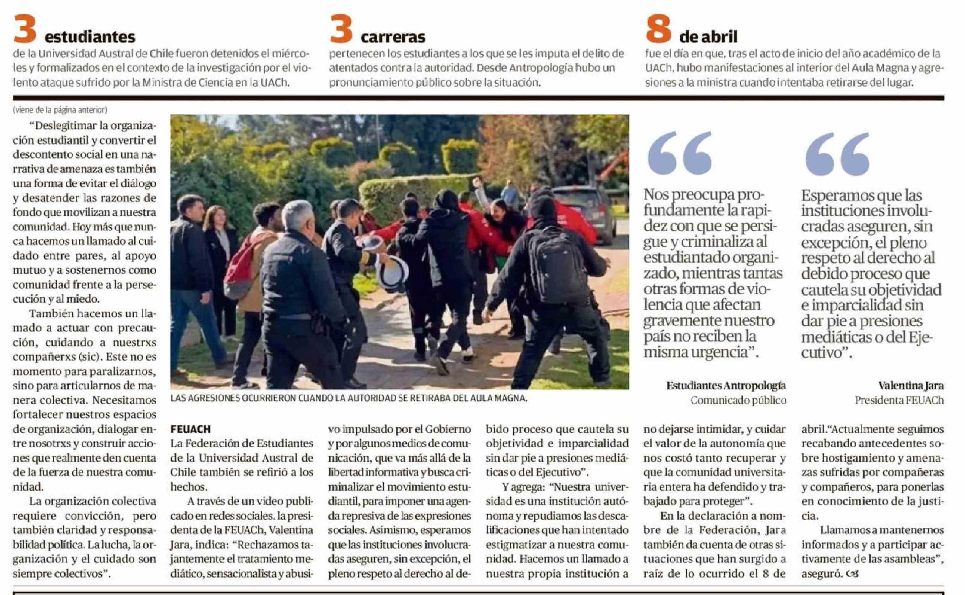 Organizaciones estudiantiles UACH fijan posturas por tres detenciones 22-04-2026 Diario Austral Región de Los Ríos |