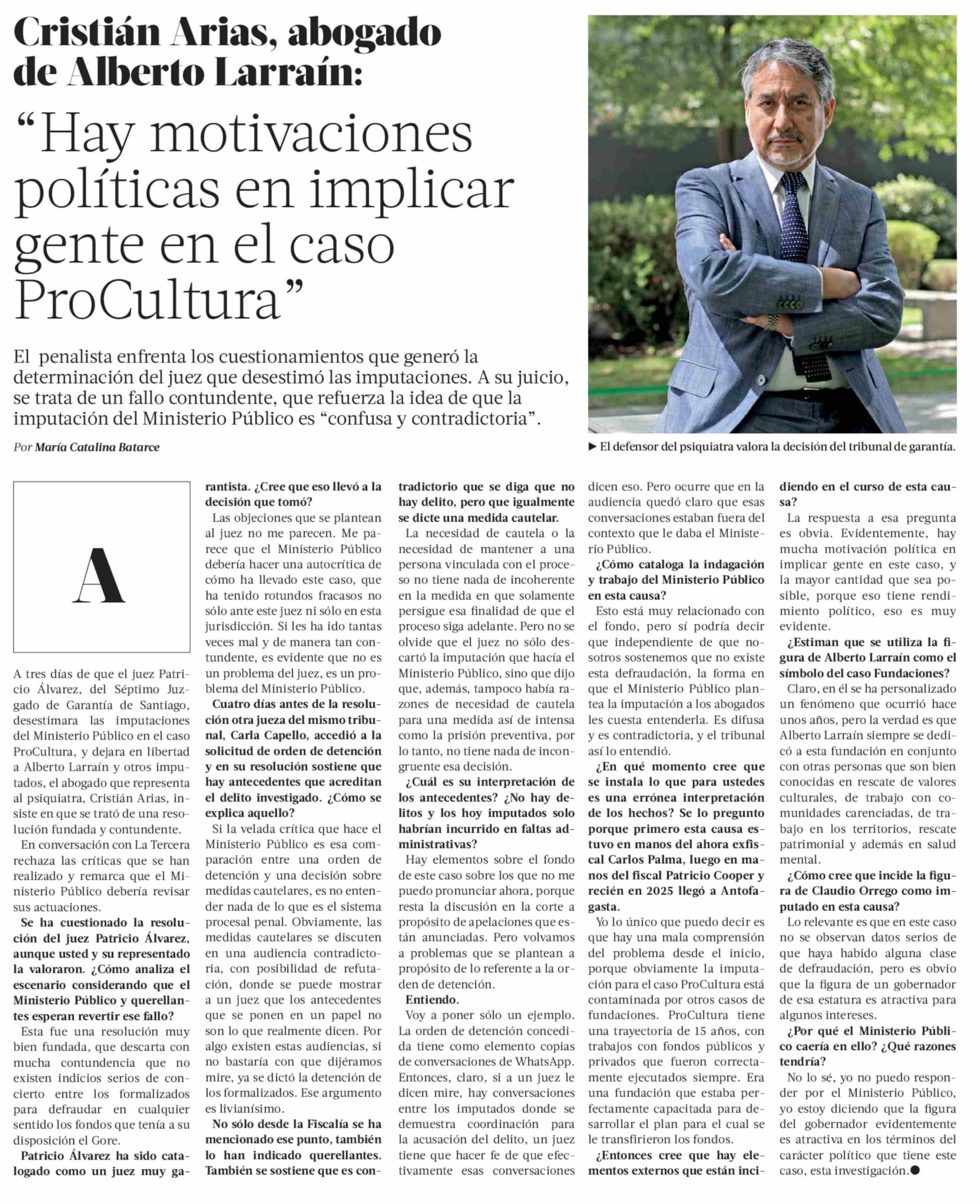 Título: "Hay motivaciones políticas en implicar gente en el caso ProCultura"