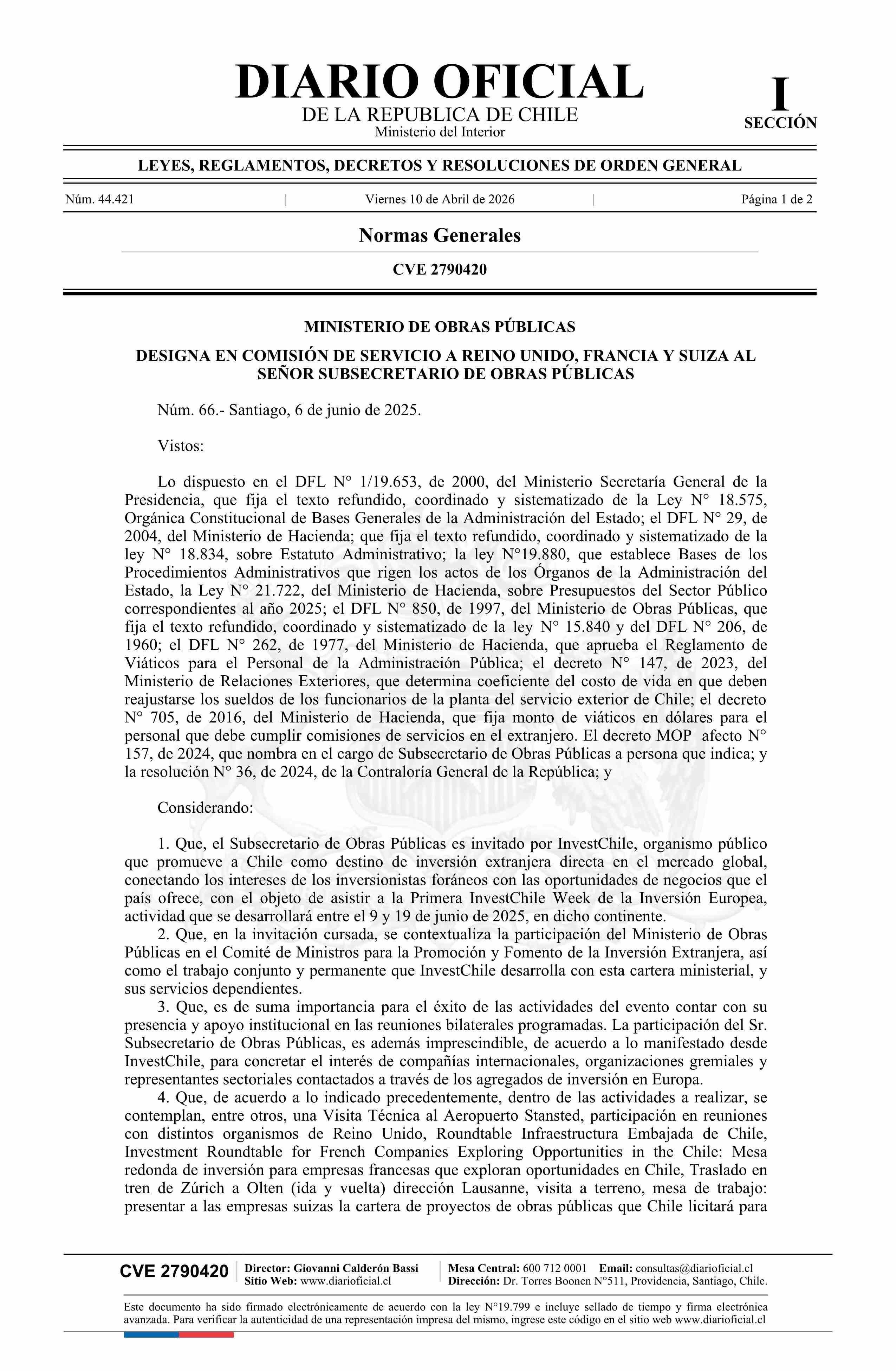 Decreto número 66, de 2025.- Designa en comisión de servicio al extranjero a don Danilo Núñez Izquierdo, Subsecretario de Obras Públicas, a Reino Unido, Francia y Suiza 10-04-2026 Diario Oficial Edición Electrónica |