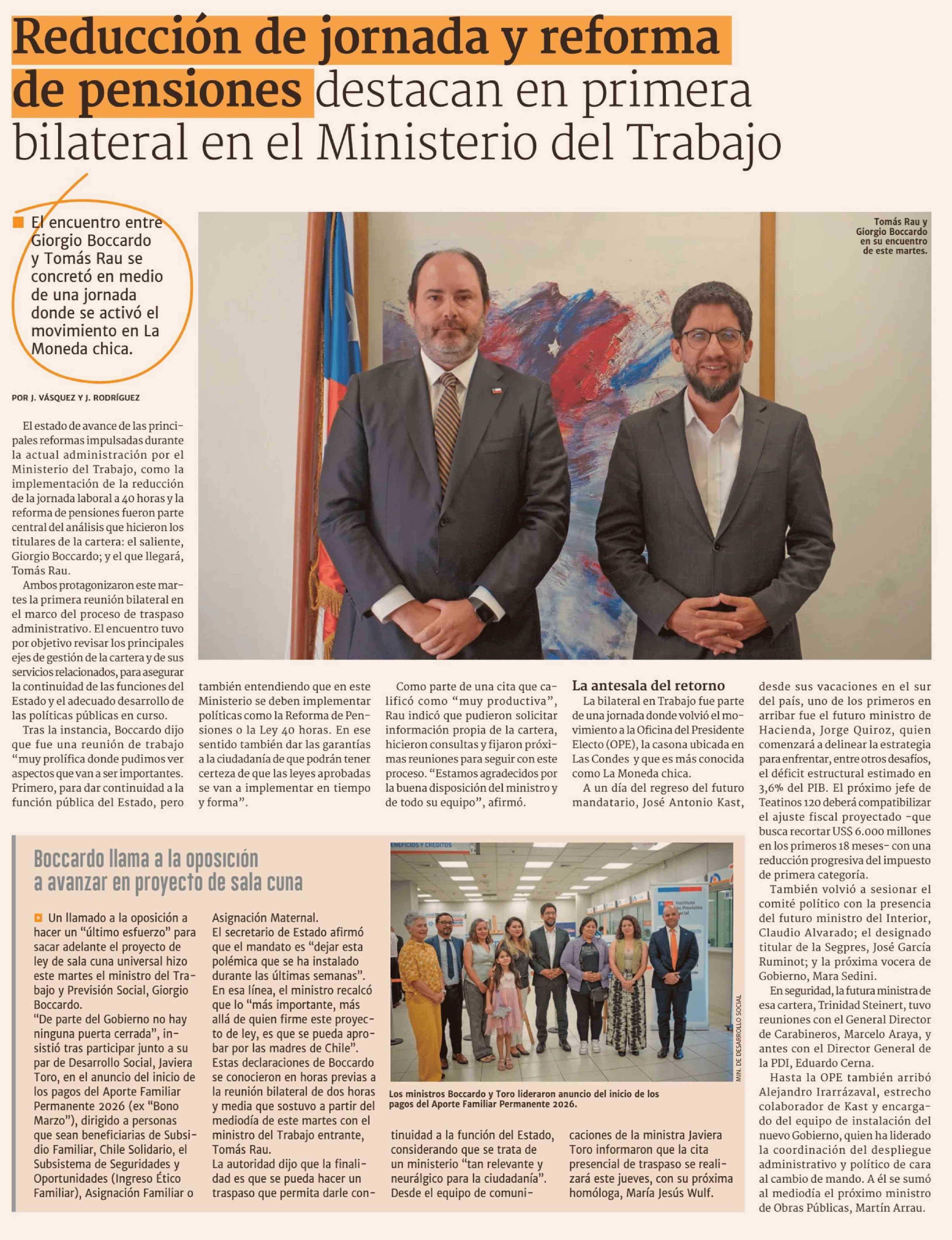 Reducción de jornada y reforma de pensiones destacan en primera bilateral en el Ministerio del Trabajo 18-02-2026 Diario Financiero |