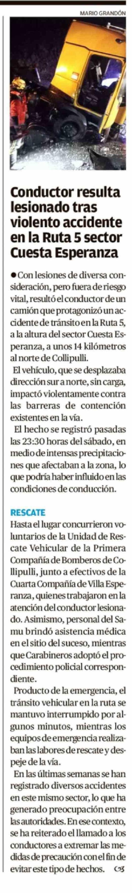 | Título: | Conductor resulta lesionado tras violento accidente en la Ruta 5 sector Cuesta Esperanza |