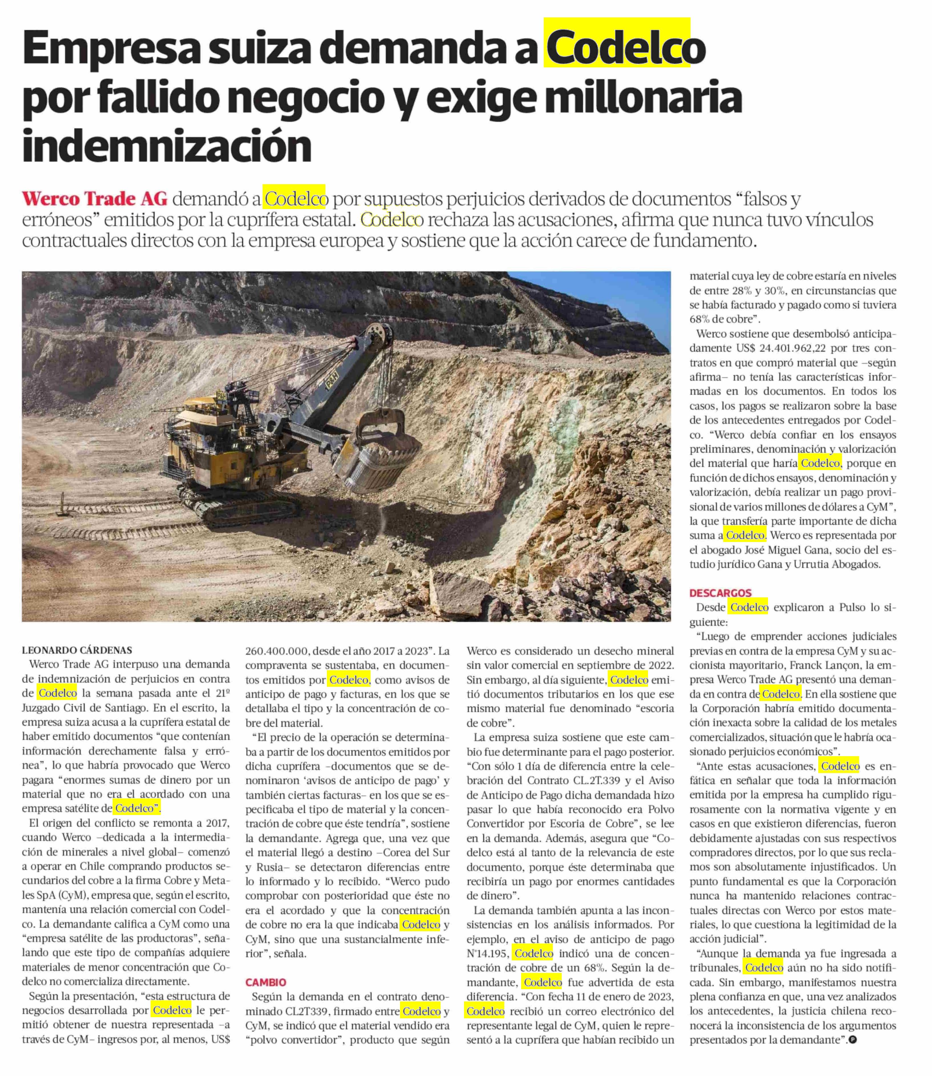 | Título: | Empresa suiza demanda a Codelco por fallido negocio y exige millonaria indemnización |