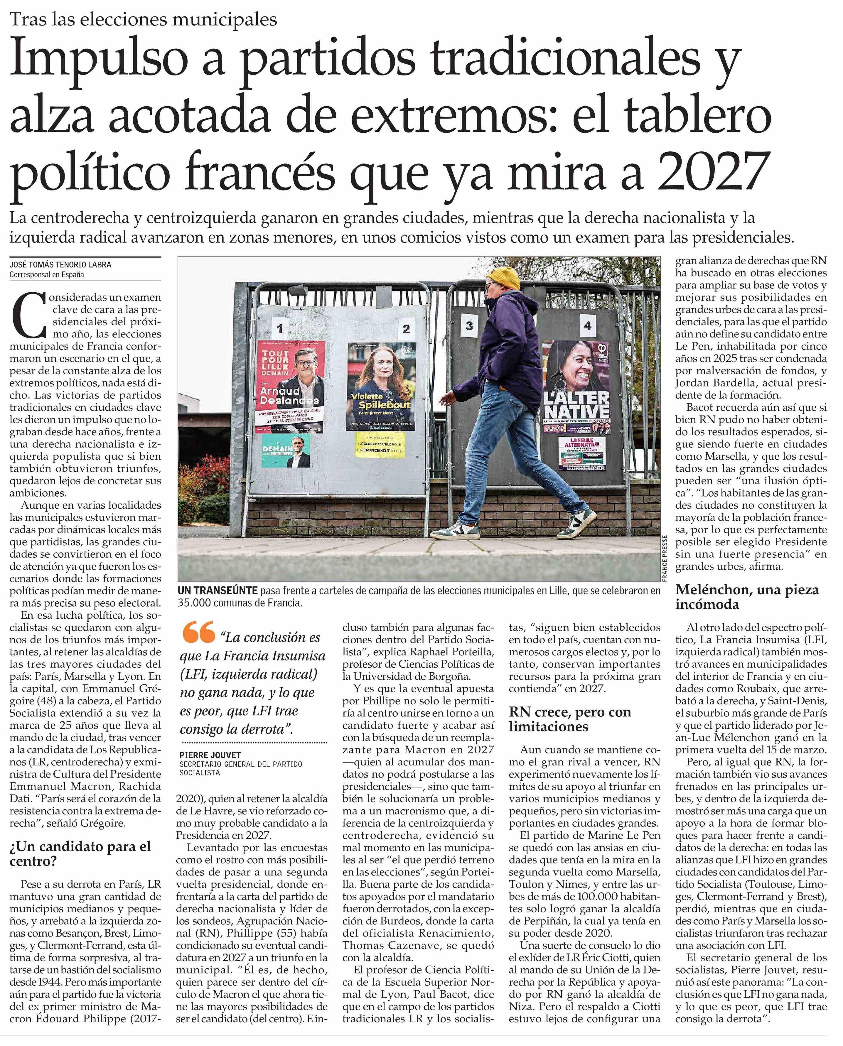 Impulso a partidos tradicionales y alza acotada de extremos: el tablero político francés que ya mira a 2027 25-03-2026 El Mercurio |
