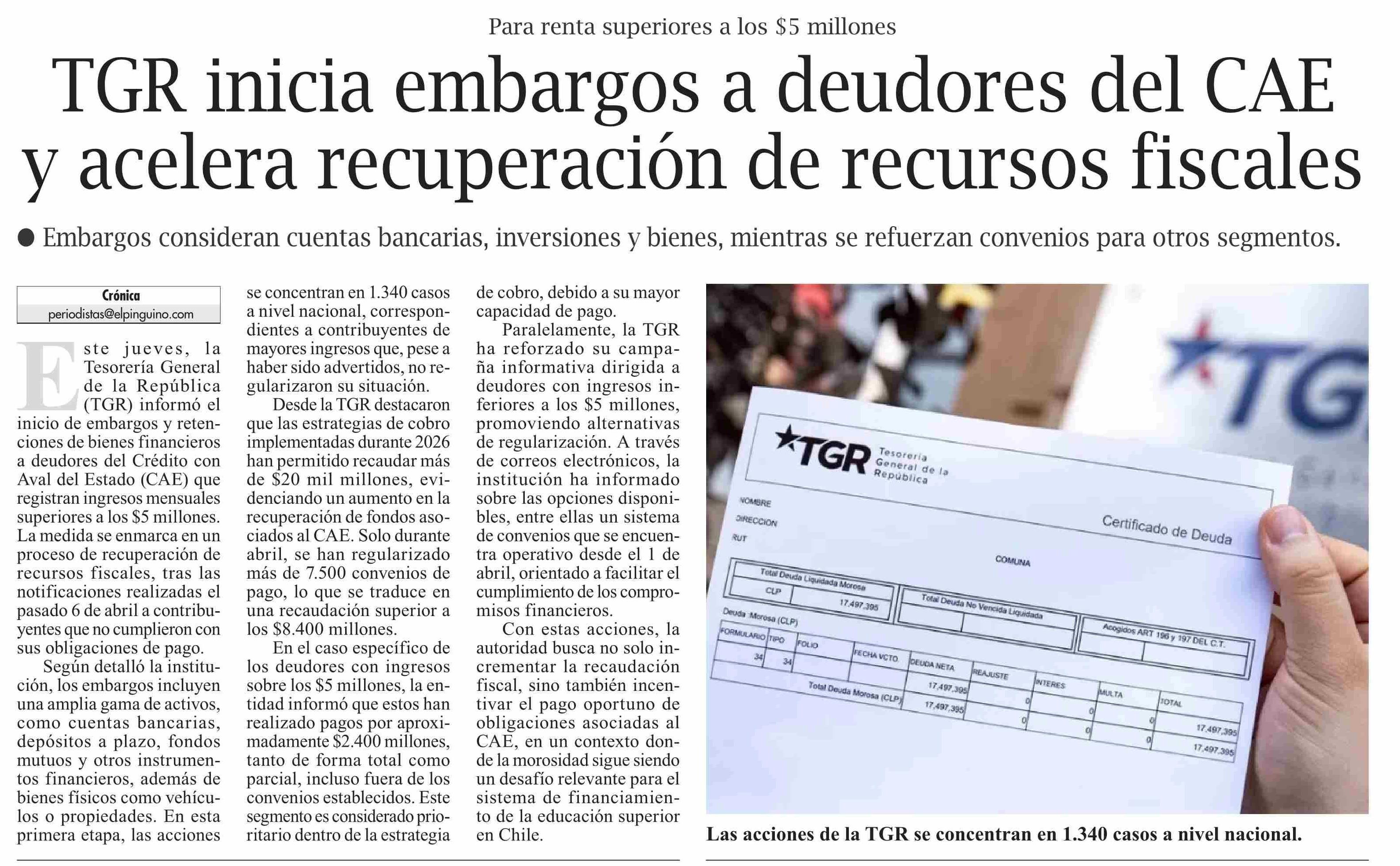 TGR inicia embargos a deudores del CAE y acelera recuperación de recursos fiscales 24-04-2026 El Pingüino |