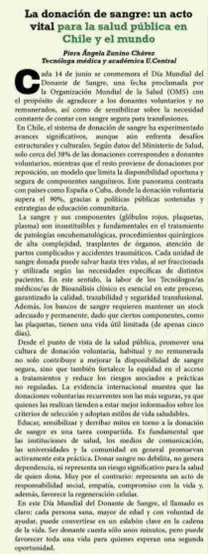 | Título: | COLUMNAS DE OPINIÓN: La donación de sangre: un acto vital para la salud pública en Chile y el mundo |