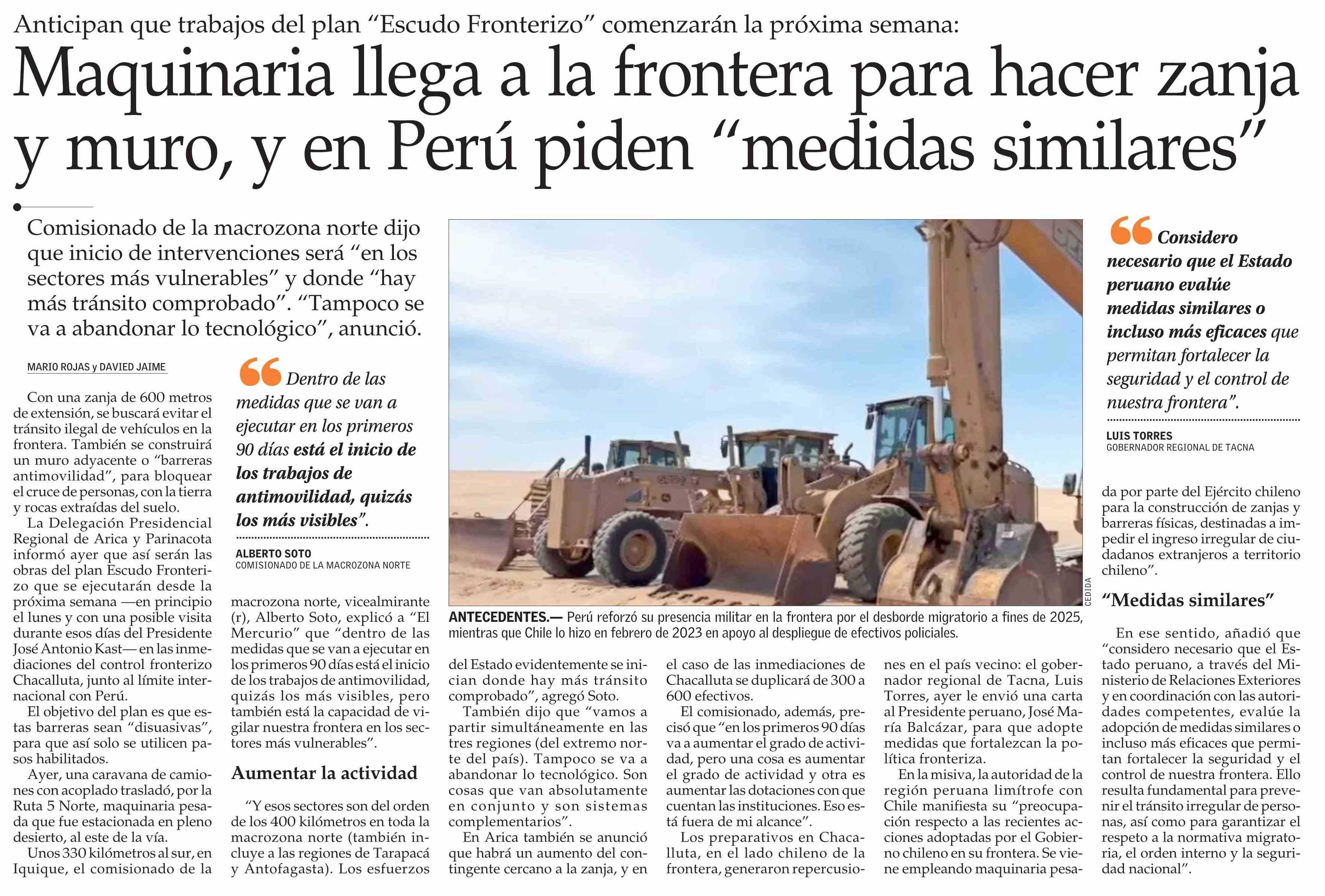 Maquinaria llega a la frontera para hacer zanja y muro, y en Perú piden “medidas similares” 14-03-2026 El Mercurio |