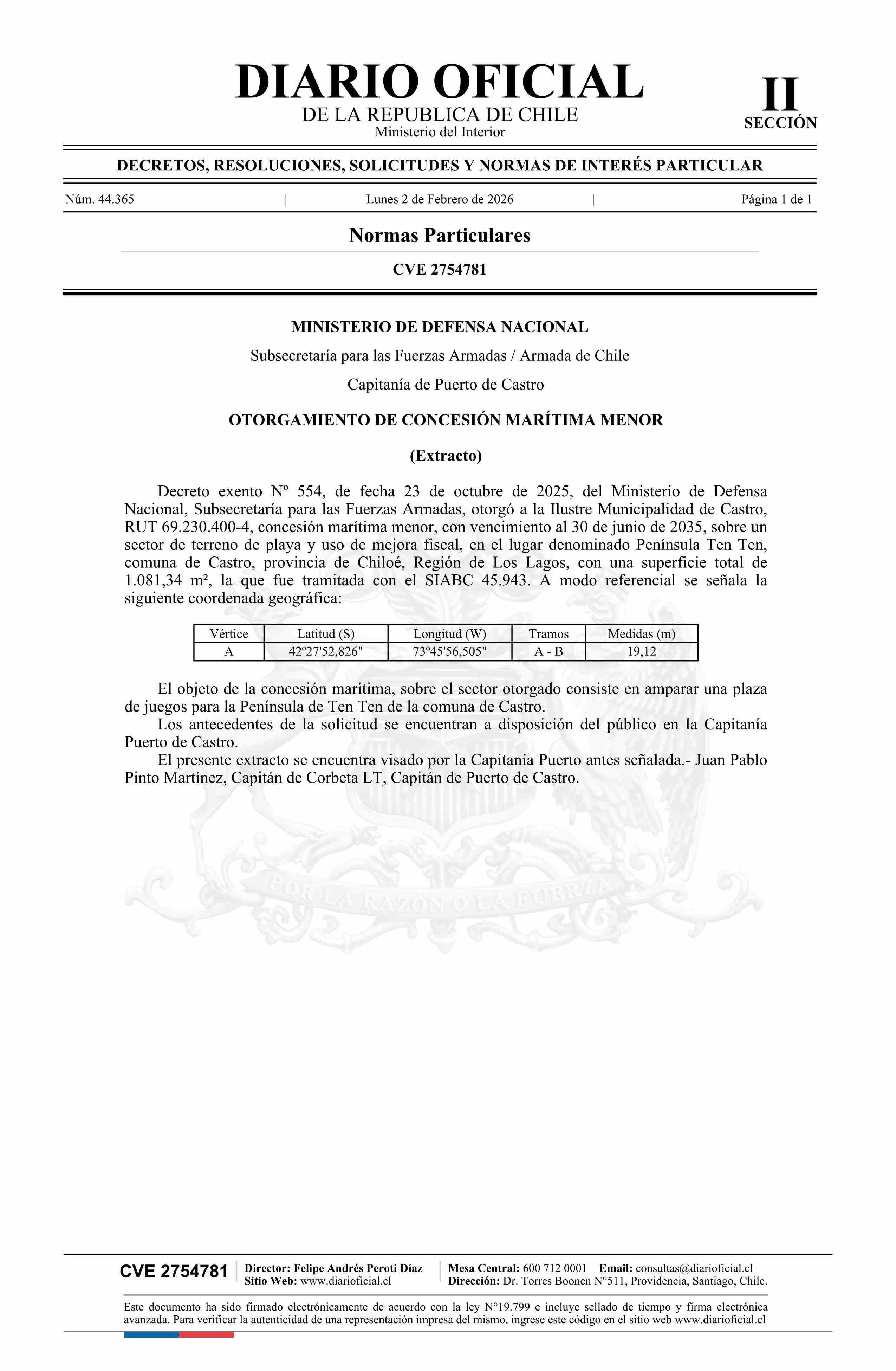 | Título: | Extracto de decreto exento número 554, de 2025.- Otorgamiento de concesión marítima menor |