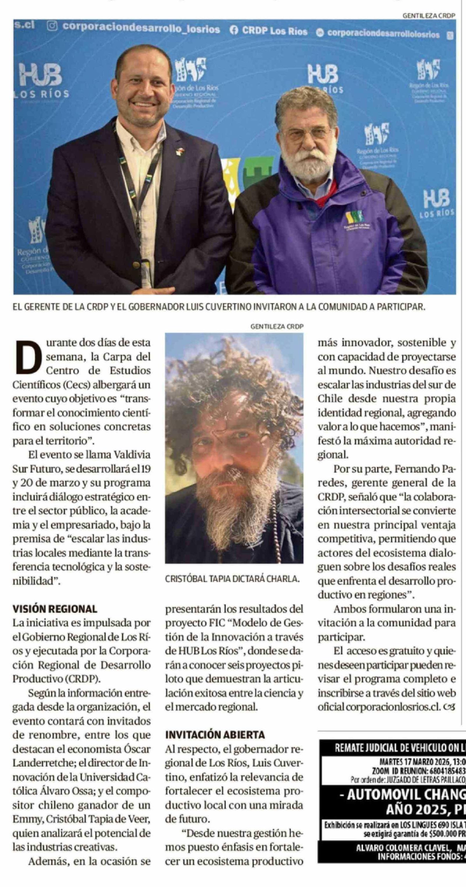 | Título: | Científicos (Cecs) albergará un evento cuyo objetivo es "transformar el conocimiento científico en soluciones concretas para el territorio". El evento se llama Valdivia Sur Futuro, se desarrollará el 19 y 20 de marzo y su programa incluirá diálogo estratégico entre el sector público, la academia y e |