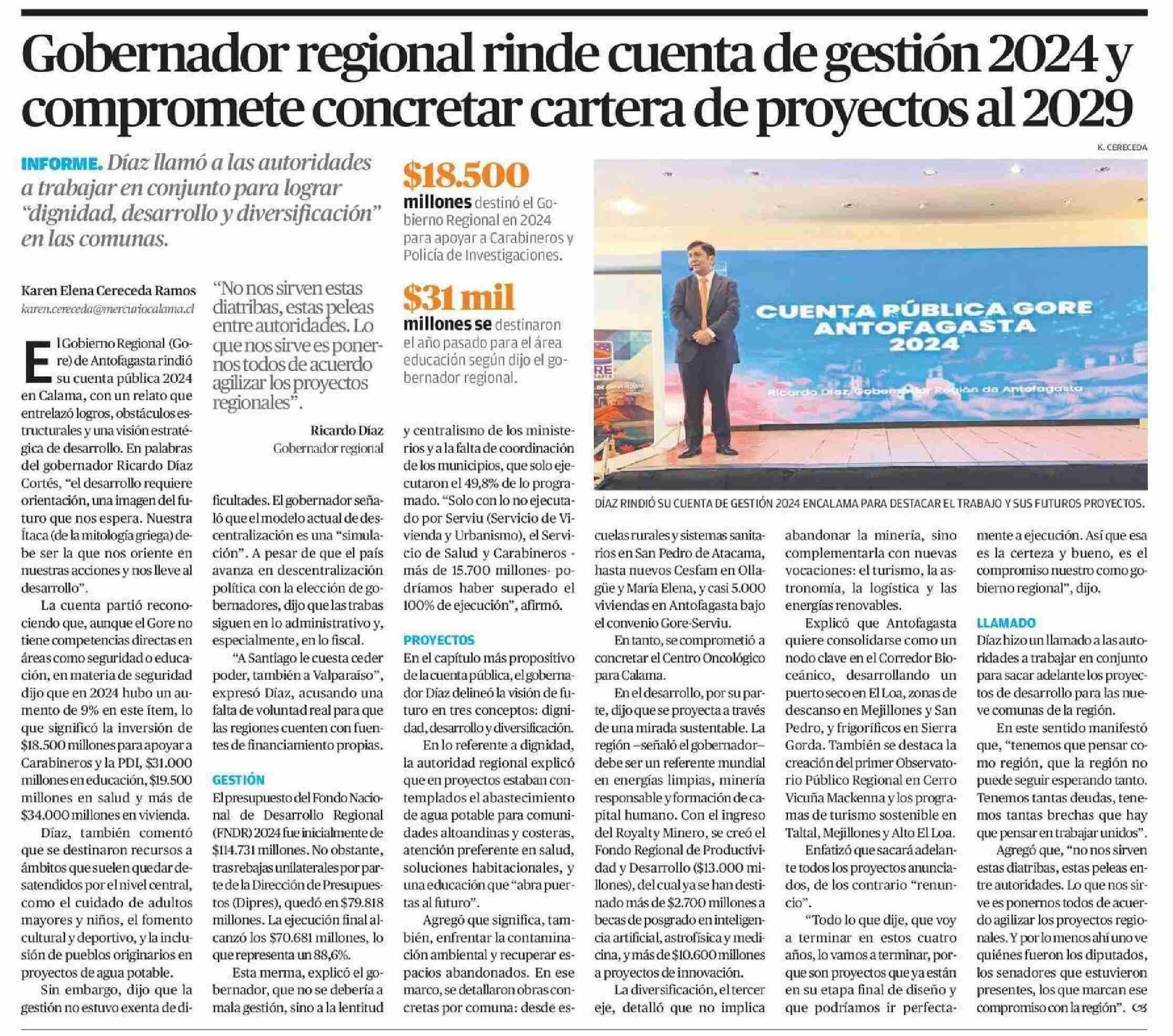 Gobernador regional rinde cuenta de gestión 2024 y compromete concretar cartera de proyectos al 2029 31-05-2025 El Mercurio de Antofagasta |