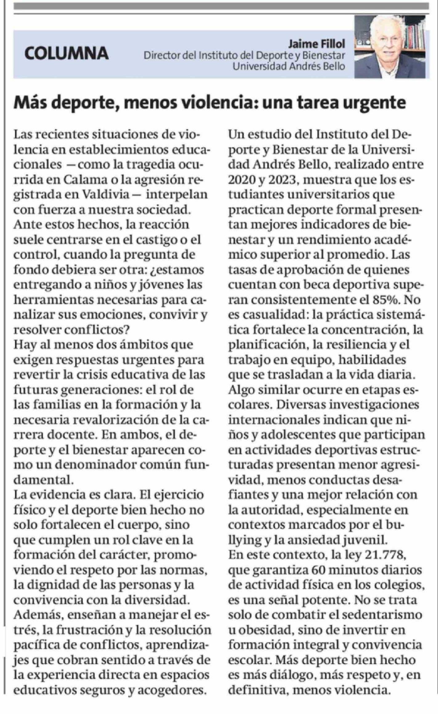 Columnas de Opinión: Más deporte, menos violencia: una tarea urgente 29-04-2026 La Estrella de Concepción |