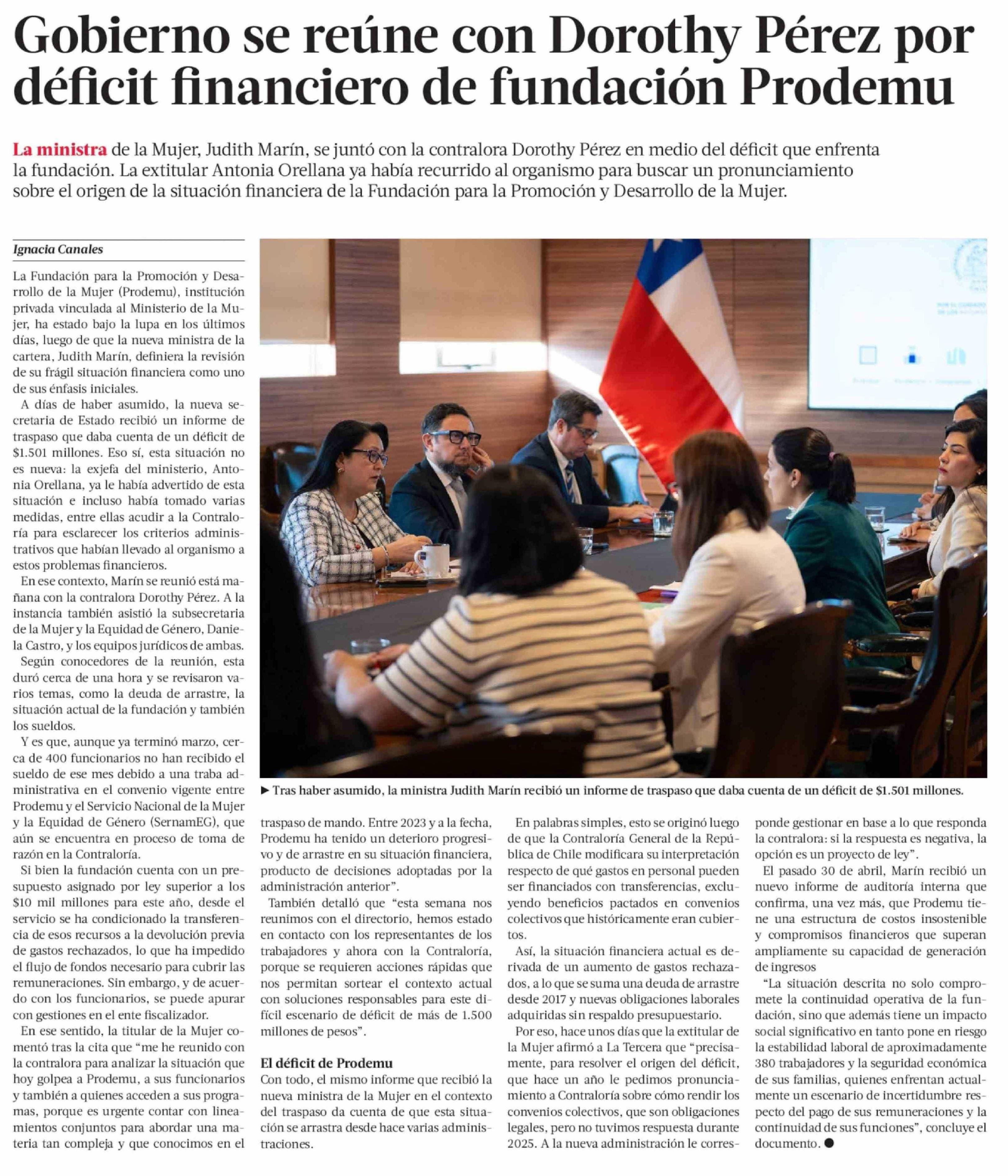| Título: | Gobierno se reúne con Dorothy Pérez por déficit financiero de fundación Prodemu |