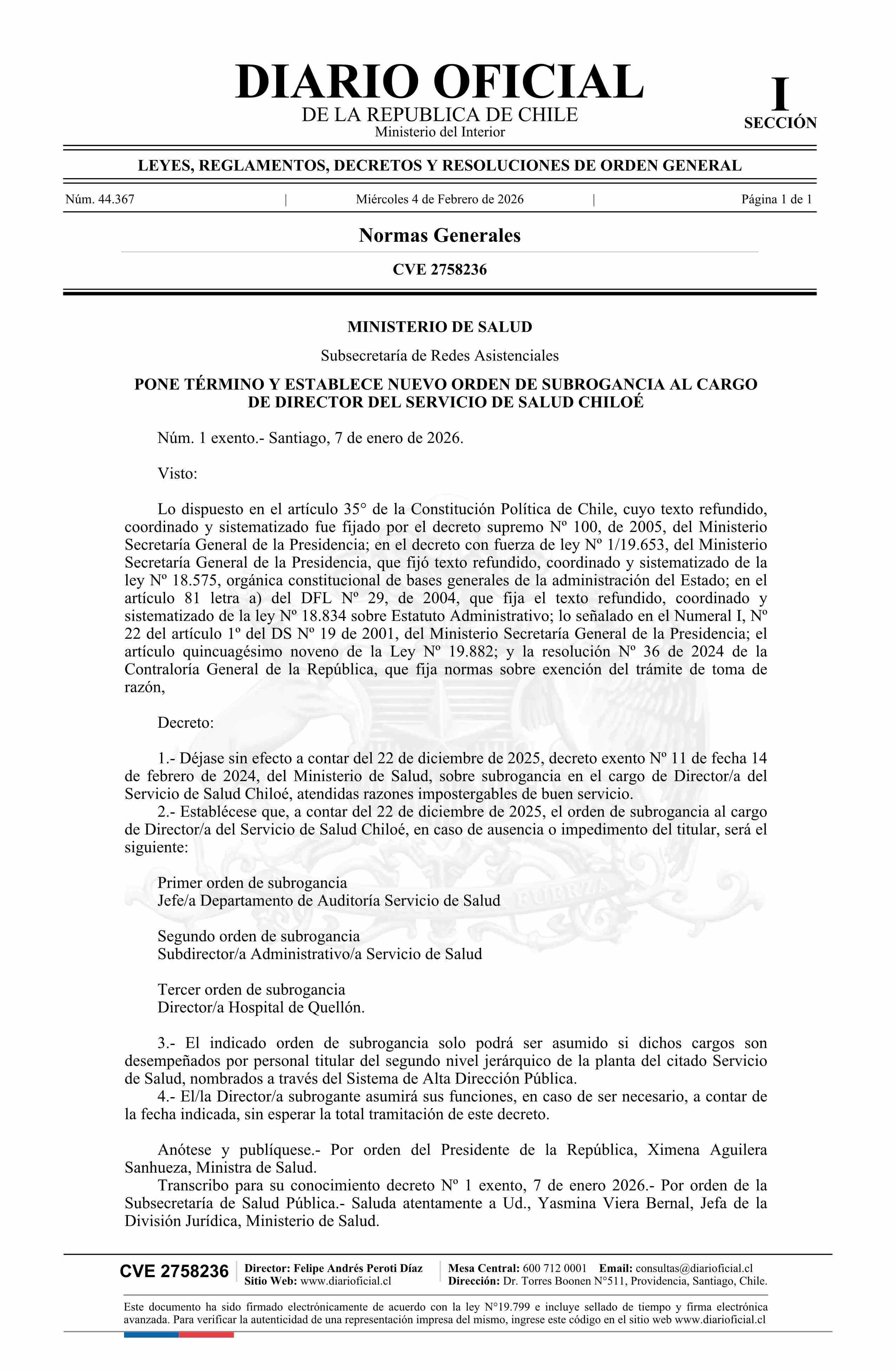 Título: Decreto exento número 1, de 2026.- Pone término y establece nuevo orden de subrogancia al cargo de Director del Servicio de Salud Chiloé