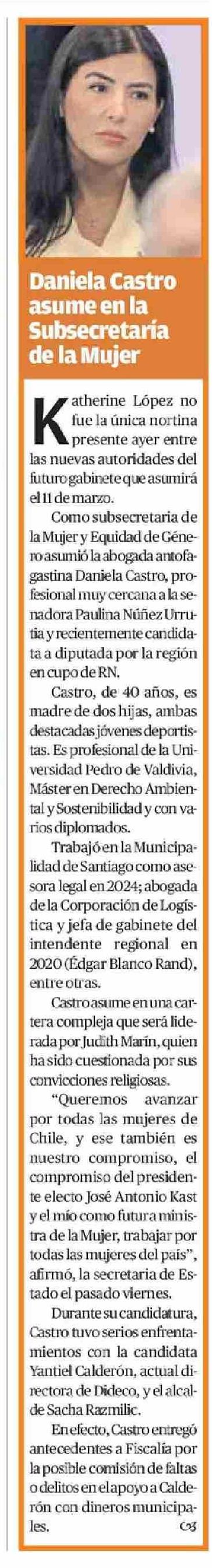 Daniela Castro asume en la Subsecretaría de la Mujer 08-02-2026 El Mercurio de Calama |