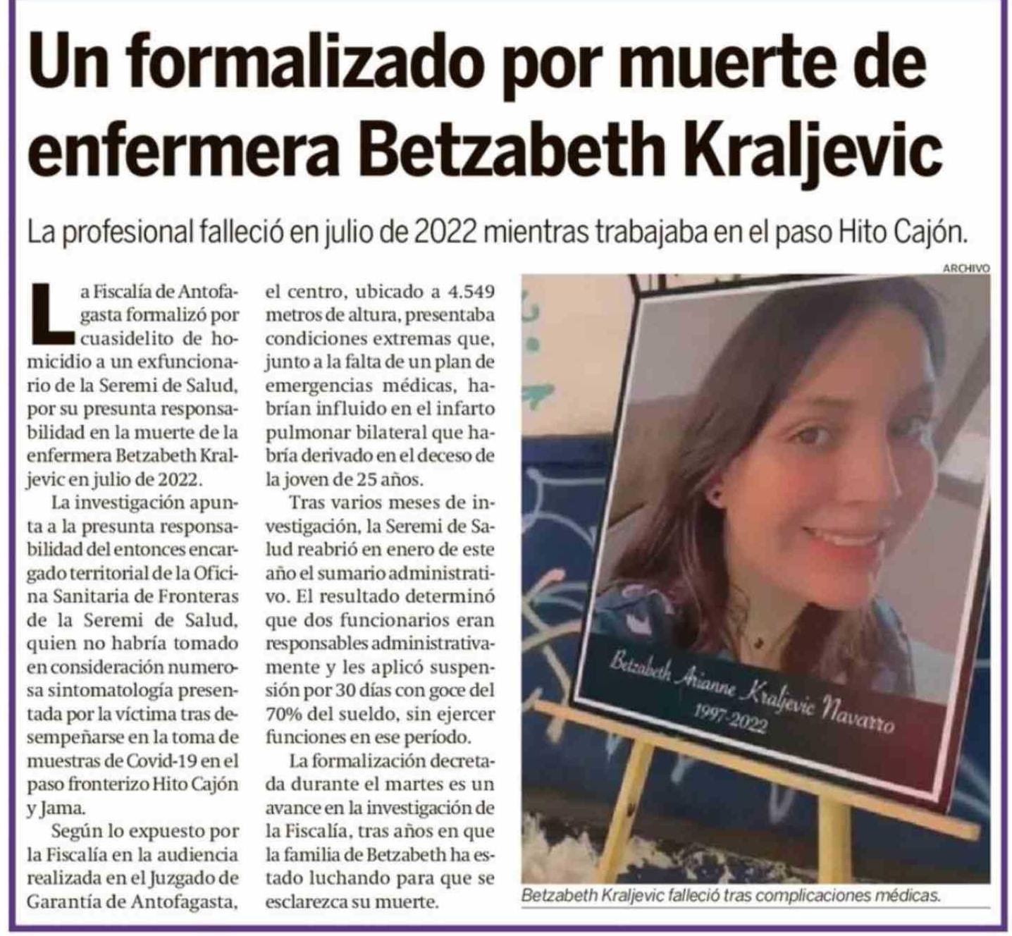 Título: Un formalizado por muerte de enfermera Betzabeth Kraljevic